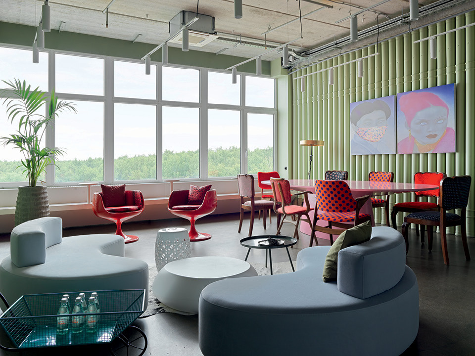 Офис химической компании в бизнес-центре в Румянцево Анна Эрман превратила в необычное пространство, использовав канализационные трубы, канистры и шелк для платьев.
