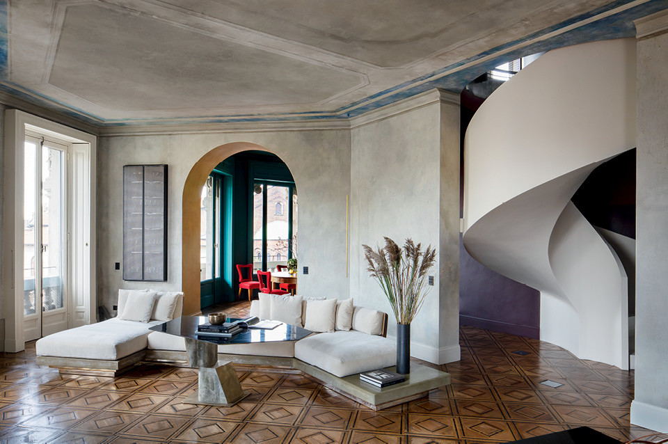 Милан — не тот город, который первым приходит на ум, когда заходит разговор о красотах Италии. На фоне Рима или, например, Флоренции он кажется слишком серым, деловым, прозаичным. Он раскрывается перед вами не сразу, как и миланские дома, которые обращены на улицу большими тяжелыми и вечно закрытыми воротами — поди догадайся, что там внутри. Здание начала ХХ века, в котором располагается эта квартира, снаружи тоже выглядит довольно неприступно. Зато перед его обитателями город как на ладони. Отсюда открывается отличный вид на парк Семпионе и триумфальную арку Мира — кажется, что венчающая ее упряжка лошадей мчится во весь опор по зеленым волнам.