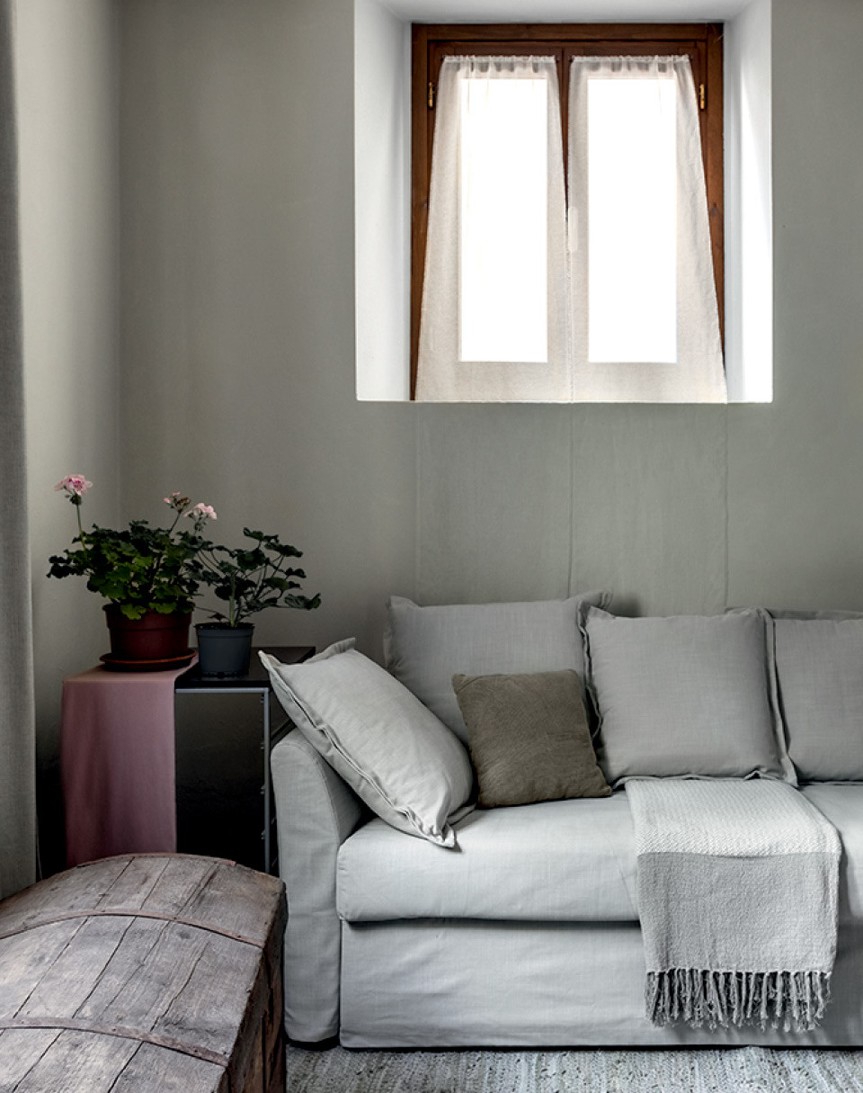 Отделка тоже получилась оригинальной: фактурная стена в ванной осталась после того, как с нее сбили керамическую плитку, а в гостиной стены готовили под покраску, но после нанесения штукатурки передумали — так гораздо живописней. Только в спальне появляется цвет, но и здесь Петр и Дарья постарались создать впечатление, будто это исторические наслоения разных оттенков. На полу на обоих этажах лежала квадратная плитка в мелкую крапинку (такую расцветку еще называют “соль-перец”). На первом ее покрыли эпоксидной затиркой, а на втором покрасили и положили сверху ковры, привезенные из Марокко. Так благодаря смелым решениям архитекторов получился органичный интерьер с итальянской душой.