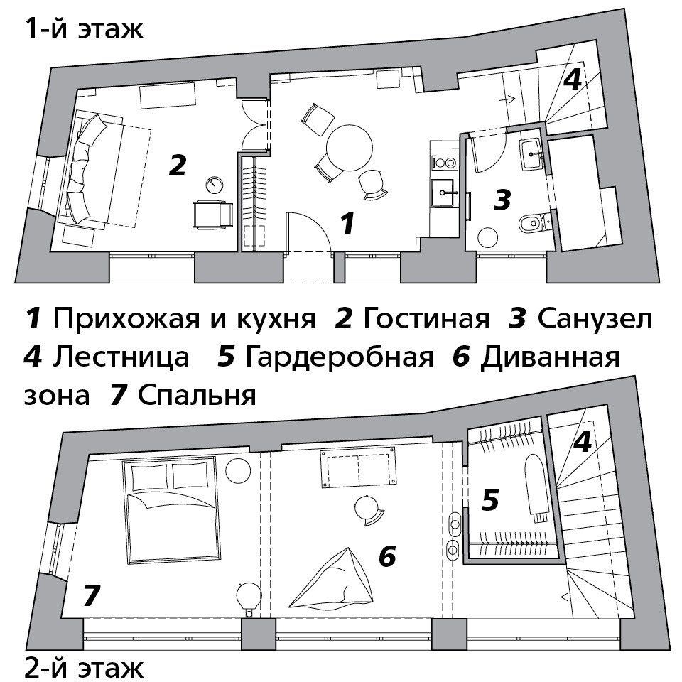 Перед Петром и Дарьей стояла задача сделать необычный интерьер с минимальными финансовыми вложениями, и они его собирали из неожиданных находок. К примеру, у изголовья кровати стоит фрагмент старой ограды, который нашли на участке, там же подобрали жестяной лист, покрыли его лаком и превратили в кухонный фартук. А вот старинный сундук, который можно увидеть в гостиной, им подарили соседи. Остальную мебель “с историей” покупали в ближайших антикварных магазинчиках. Так, в роли письменного стола выступает бывший стол мясника, поэтому вся его поверхность иссечена ножом, прикроватной тумбочкой служит верстак сапожника, распашные двери в гостиную когда-то были воротами, а окно на кухне декорировано старыми кружевами от скатерти. Есть тут и очищенное от лака советское кресло, привезенное Петром, которое по фактуре идеально вписалось в обстановку. Для ступеней лестницы и фасадов кухни использовали доски от старых строительных лесов. Кстати, лестница заслуживает особого внимания: один из ее фрагментов сделан из гнутого листа металла. Таким образом архитекторы выкроили место под душ, который находится внизу: для металлической части не нужен каркас, и это добавило несколько сантиметров душевой кабине.