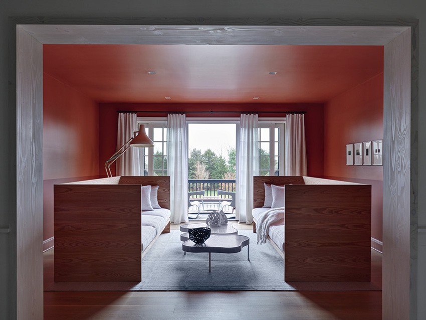 Всего в этом доме шесть спален, и каждые выходные, а также все летние месяцы тут собираются три поколения семьи (заказчики, их родители и дети) и их хорошие друзья — всегда не меньше десяти человек. Иган организовала все пространство таким образом, что на каждом этаже и практически в каждой части дома есть общая зона, где все могут собираться вместе или группироваться по интересам. Диваны и кресла готовы в любой момент вместить всех желающих, они стоят не только в комнатах, но также на террасе и даже на крыльце. Если все спальни заняты, гостей могут разместить на ночь в этих общих зонах.