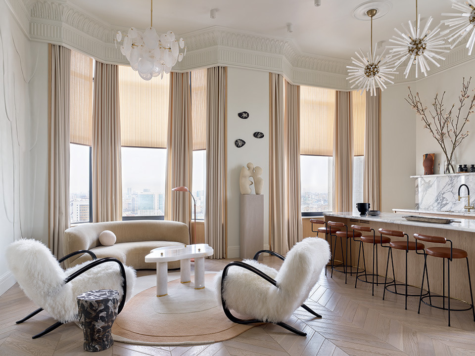 Одним из источников вдохновения для дизайнера Екатерины Лашмановой стал фасад дома: он вырос в глубине квартала, но стилизован под одну из “сталинок” на первой линии Ленинградского проспекта. Парадное “лицо” магистрали определяют величественные здания, украшенные башенками, портиками, арками, колоннами и ракушками, которые позже были признаны излишествами.