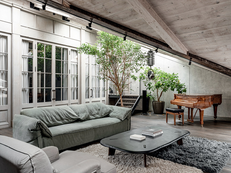 Гостиная. Стол из сланца, Joris Van Apers; диван, Baxter; ковер, CC Tapis. На рояле марки Steinway играет хозяин дома. Перегородки сделаны по дизайну Дмитрия Розова в компании Art_mobiliere и им же собственноручно окрашены.