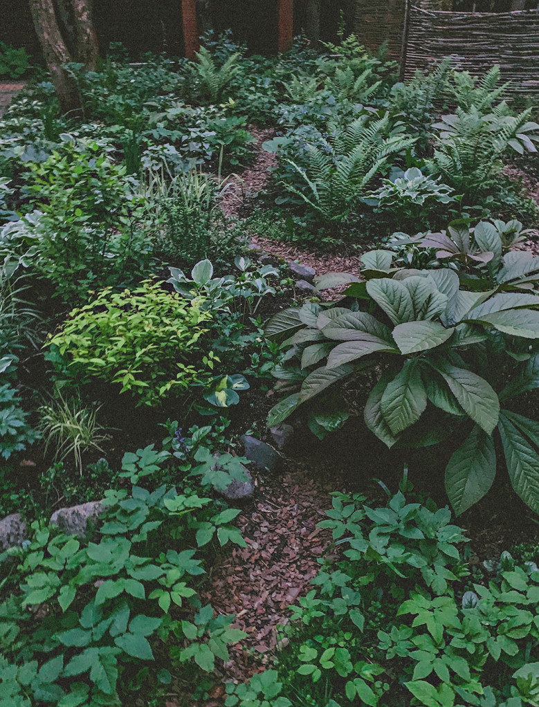 Но от голого пустыря до момента, когда растения начали тесниться, прошло совсем немного времени. Оказалось, что теневой сад, если хочется сохранить его структуру и идею, — это огромная ежедневная работа. Но она приносит удовольствие. Это медитация и разговор с растениями, разговор с Богом. Оля говорит, что стала фанатом дождей: «Смотрю прогноз погоды, призываю дождь, потому что никакой полив не работает так, как дождь».