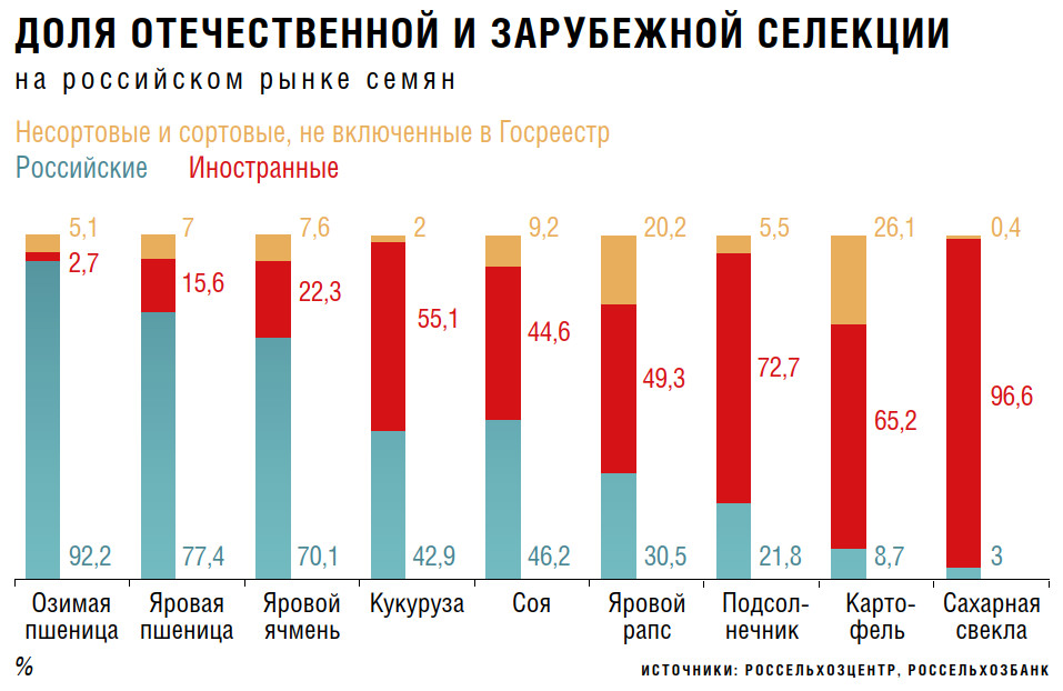 Наибольшая доля импортной продукции пока сохраняется в таких сегментах, как сахарная свекла (на российскую селекцию приходится лишь около 2 %), кукуруза (41,8 %) и картофель (около 7 %). Однако селекционеры и семеноводы страны активно работают в этих направлениях.