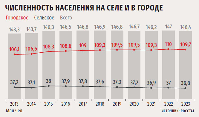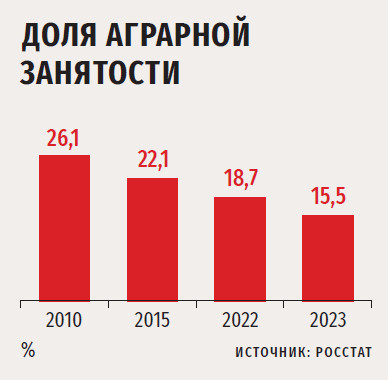 За последние 10 лет численность сельского населения то увеличивалась, то уменьшалась (см. график выше) и к 2023 году, по данным Росстата, составила около 36,8 млн чел. (в 2013-м — 37,2 млн). За данный период доля городских жителей выросла на 1 % — с 74 до 75 %, а сельских, соответственно, на столько же опустилась. Интересно, что сто лет назад на селе проживало около 84 % россиян, то есть показатель сократился более чем в три раза. При этом из оставшихся 25 % сельского населения, а это 36–37 млн человек, в АПК заняты только около половины (53 %), или каждый второй. Это значит, что снижение численности селян в три раза несущественно и компенсируется современными технологиями, а дефицит кадров может быть преодолен за счет изменения кадровой политики с целью привлечения безработных сельских жителей, закрепления старых работников или привлечения новых.