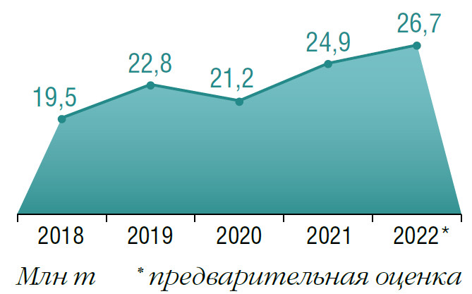 По данным Росстата, в 2022 году производство трех основных масличных культур составило 24,8 млн т против почти 23,3 млн т годом ранее. Валовой сбор соевых бобов, в частности, увеличился на 1 млн т, до 5,8 млн т (в 2021-м — 4,8 млн т), урожай рапса вырос более чем в 1,6 раза, до 4,5 млн т (годом ранее — 2,8 млн т). А вот объем производства подсолнечника в прошлом году был меньше, чем в 2021-м, — 14,5 млн т против 15,7 млн т соответственно. Помимо этого, свой весомый вклад в общий урожай внес масличный лен — его было намолочено порядка 1,5 млн т.