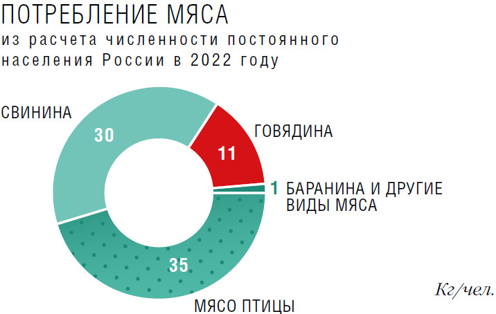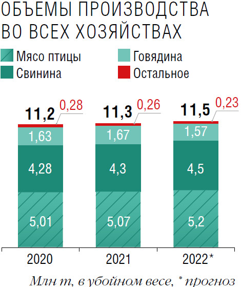 Суммарный объем производства основных видов мяса по итогам 2022 года может составить 11,5 млн т во всех хозяйствах, прогнозирует коммерческий директор информационно-аналитического агентства «ИМИТ» Любовь Савкина. Так, выпуск свинины, по ее оценкам, увеличится в пределах 9 % и достигнет 4,5 млн т, мяса птицы — на 4 %, до 5,2 млн т, а баранины — на 2 %, до 211 тыс. т. И только сектор говядины продемонстрирует снижение объемов примерно на 4 %, до 1,57 млн т (все цифры — в убойном весе). «Таким образом, как и в последние годы, лидером мясного производства в России остается птица, но драйвером прироста — свинина», — констатирует эксперт. Правда, прогнозы могут измениться, если Росстат внесет в общий объем показатели новых регионов страны, добавляет она.