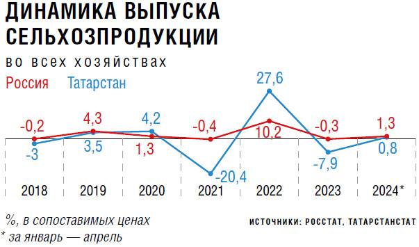 Доля АПК, включая пищевую промышленность, в ВРП в прошлом году составила 6,5 % с показателем 590,8 млрд руб. Объем валовой продукции сельского хозяйства достиг 289,2 млрд руб. По данному показателю республика входит в топ-5 регионов России, обращает внимание министр. Располагая 2 % сельхозугодий страны, аграрии Татарстана выпускают 3,5 % общего объема отечественной сельхозпродукции. Данные показатели достигнуты в том числе благодаря проведению комплекса мероприятий по модернизации существующих мощностей и реализации новых инвестиционных проектов, отмечает он. «Наш регион — бесспорный лидер по производству молока в России, за нами более 6 % всего валового надоя! Также стабильно входим в десятку крупнейших производителей основных видов аграрных товаров, таких как мясо, зерно, картофель, сахарная свекла и яйца», — подчеркивает Зяббаров.