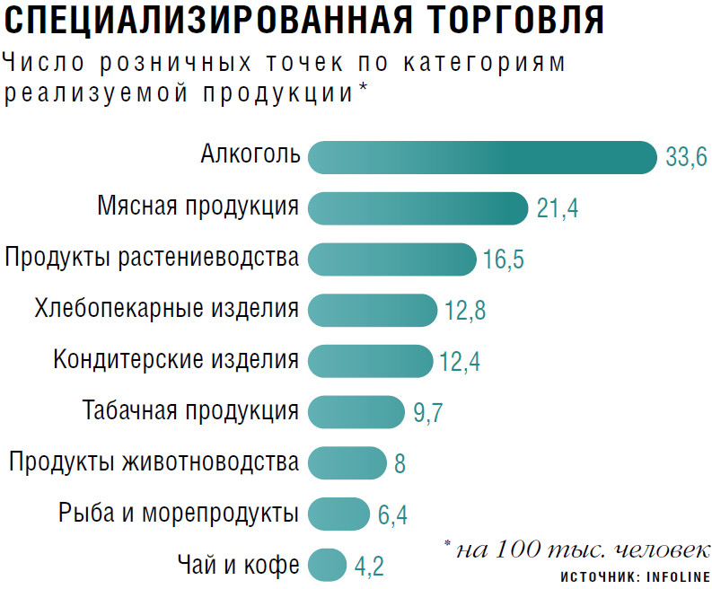 Подробные исследования рынка фирменных магазинов производителей продукции АПК в России не проводились. Так, по данным информационно-аналитического агентства INFOLine, в 2021 году более половины оборота российского FMCG-ритейла приходилось на 100 торговых сетей, а примерно 14 % — на несетевую розницу. Однако фирменные розничные сети сельхозпроизводителей в структуре этого рынка никак не обозначены. Ранее гендиректор INFOLine Иван Федяков также указывал, что на начало 2021 года в России насчитывалось более 200 тыс. специализированных продуктовых магазинов (см. график). Среди них торговых точек, специализирующихся на продаже мясной продукции, было чуть более 30 тыс., реализацией другой продукции животноводства занимались примерно 12 тыс., а продукции растениеводства — около 24 тыс. Эти подсчеты включают как фирменные магазины типа «Мясницкий ряд», принадлежащие определенному производителю продуктов питания, так и специализированные магазины с условным названием «Мясной рай», где представлена продукция разных компаний.