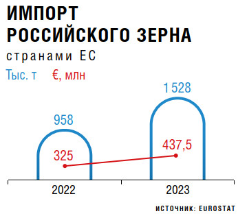 Экспорт российского зерна в страны Европейского союза вырос с 960 тыс. т в 2022 году до 1,5 млн т в 2023-м, подсчитала Еврокомиссия. Всего же в Россию из ЕС за прошлый год, по оценке представителей ЕК, было поставлено 4,2 млн т зерновых, масличных культур и продуктов их переработки на сумму €1,3 млрд. Из Беларуси было ввезено еще около 610 тыс. т данной продукции стоимостью €246 млн. С учетом всех торговых партнеров в 2023 году Евросоюз импортировал 37,2 млн т зерновых и 39,1 млн т масличных.