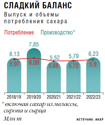 По оценке ИКАР, всего сахарной свеклой в этом году занято 1,05 млн га против 1,03 млн га в 2022-м. С учетом их состояния на июль производство сахара в сезоне 2023/24 пока ожидается больше, чем годом ранее, — не менее 6,2-6,5 млн т (в 2022/23-м — 5,9 млн т), прогнозирует Иванов.