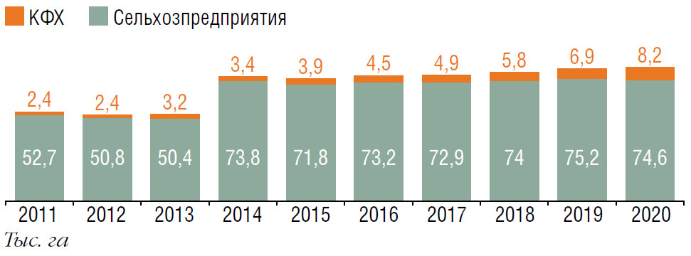 По данным Союза виноградарей и виноделов, в последние три года площади виноградников увеличиваются на 3,5 тыс. га ежегодно, однако часть новых посадок идет на замену выбывающих. НКР оценивает средний прирост виноградных насаждений в России за последние пять лет в 1,6% ежегодно. По состоянию на конец 2020-го виноградниками было занято 96,75 тыс. га, что на 1% больше, чем в 2019 году.
