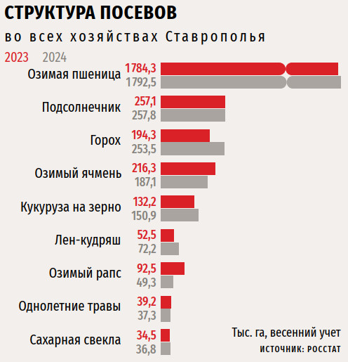 Зерновые и зернобобовые культуры занимают более 70 % в структуре посевных площадей Ставрополья. Ежегодно под них выделяется до 2,5 млн га. Основная доля приходится на пшеницу. По валовому сбору зерна — а он достигает в среднем 8,85 млн т — Ставрополье входит в тройку лидеров среди регионов страны — это настоящий хлебный край, отмечает Александр Альперин. Самыми урожайными за последние 10 лет для региона были 2016 и 2017 годы, когда местные растениеводы намолачивали свыше 10 млн т зерна. По предварительной оценке ставропольского Минсельхоза, в 2024 году аграрии края убрали зерновые культуры с площади 2,48 млн га, намолот составил 8,3 млн т — на 10 % меньше, чем в 2023-м.