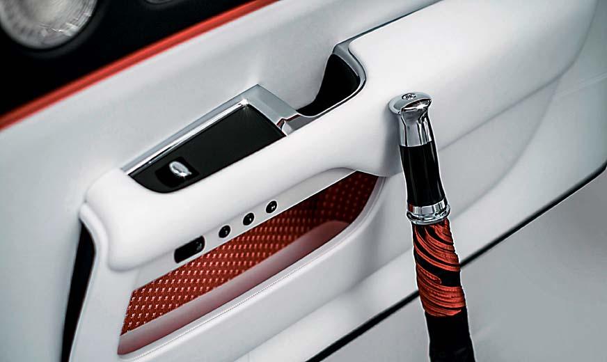 Дверные карманы кабриолета обиты тончайшим шелком с узором из фирменных эмблем марки. Каждая фигурка наклонена строго на 55 градусов, гармонично с линией двери
