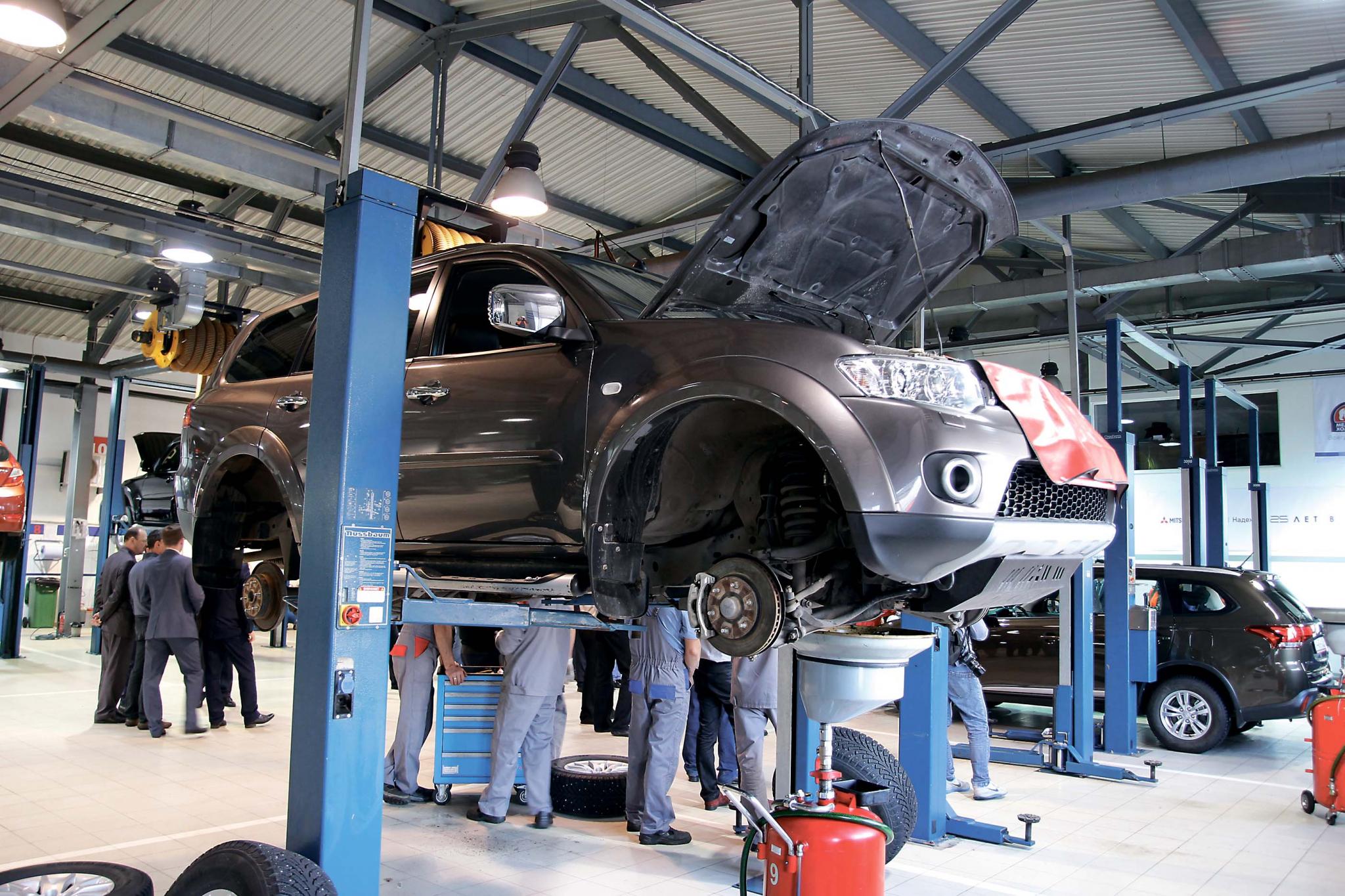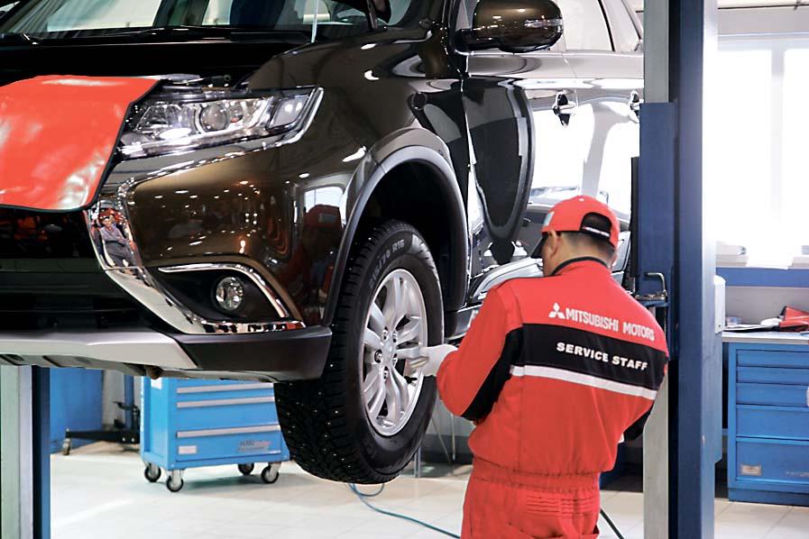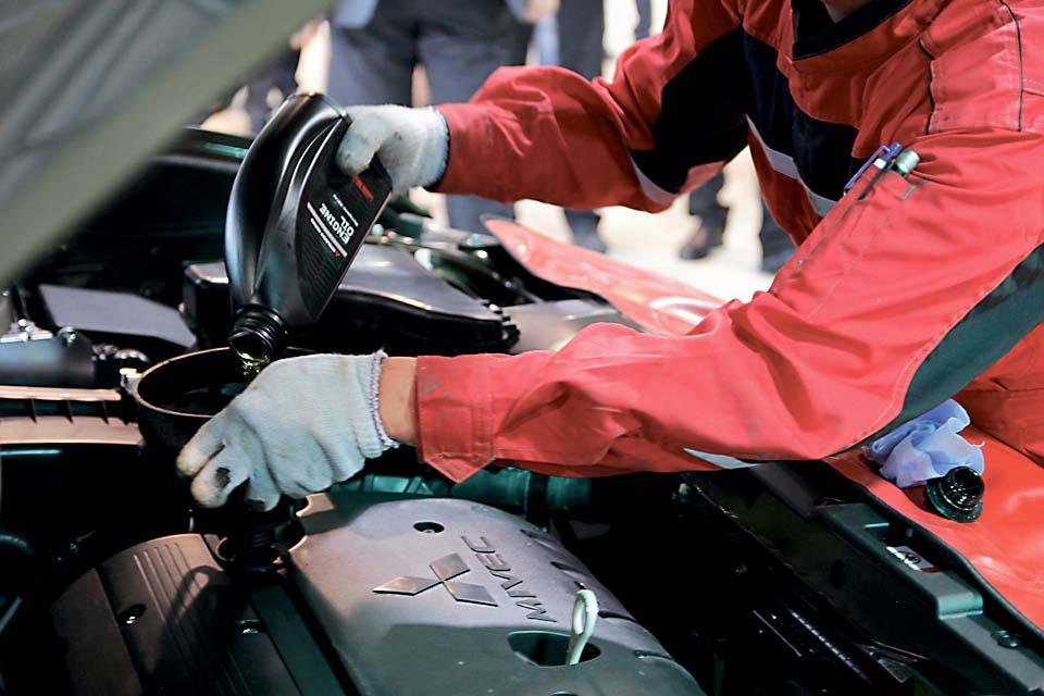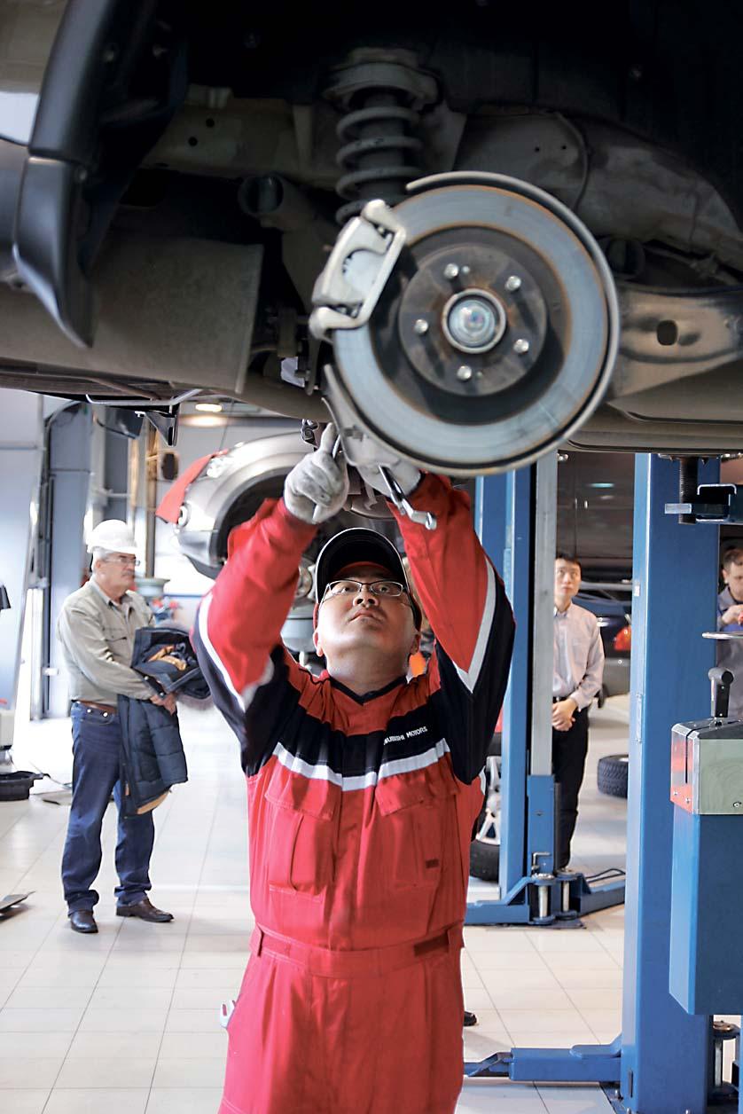 Затем Outlander оказывается на подъемнике – колеса немедленно снимают пневматическим гайковертом. Мастера – то вместе, то разделяясь, продолжают выполнять необходимые сервисные операции. Контролируют состояние подвески – пружин, амортизаторов, резинометаллических шарниров. Проверяют состояние тормозных колодок и магистралей – трубок и гибких шлангов. Тем временем из двигателя в специальный баллон собирается отработанное моторное масло. В показательном выступлении механиков, конечно, есть что-то от театра и боевых искусств – в рабочем режиме и без зрителей те же самые действия можно совершать более размеренно. Но похоже, что скорость на качество не влияет. По крайней мере, гайки в разные стороны не летят, а движения мастеров точны и многократно отработаны.