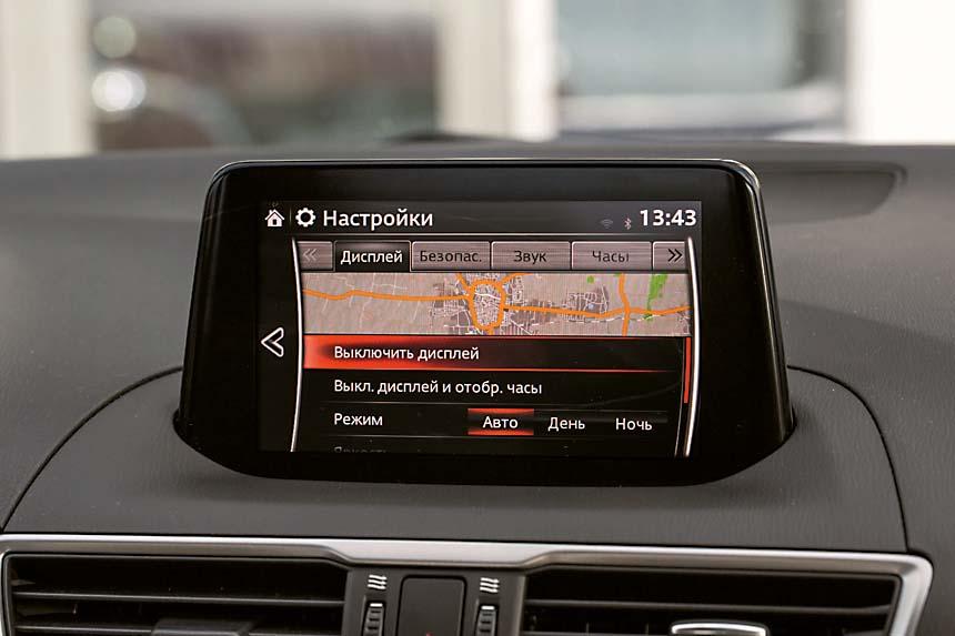 С нынешней же «Маздой» дела обстоят совсем иначе. Список оборудования радует глаз. Топовая версия Exclusive за 1 356 800 рублей, что была у нас в редакции целый месяц, оказалась богато оснащена. В холода, например, незаменимы двухзонный климат-контроль, подогрев передних кресел и – особенно – руля. Двигатель Mazda3 в мороз прогревается довольно неохотно, а вот «теплое» оборудование начинает работать практически сразу. Интерьер Mazda3 вообще дружелюбен к водителю и пассажирам. Светлая обивка сидений – настоящая находка. Редко встречающийся в суровых российских реалиях колер пришелся Mazda3 к лицу. С ним салон смотрится дорого и ярко. И материал оказался на удивление немарким – за месяц не появилось ни одного пятна. А вот с мультимедийной системой подружиться оказалось сложновато. Алгоритм ее работы не самый логичный, расстраивает и некоторая ее медлительность. Да и управление джойстиком на центральном тоннеле, успешно реализованное некоторыми конкурентами, на «Мазде» оказалось не лучшим решением. Для того, чтобы, например, ввести нужный пункт назначения в штатный навигатор, приходится совершать слишком много движений, блуждая по пунктам меню, а потом вводя точный адрес. Во время движения справится с этой задачей не так-то просто.