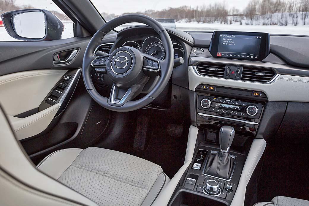 При этом у «корейца» есть преимущества перед «Маздой». К примеру, у мультимедийной системы Kia сенсорный экран, пользоваться которым гораздо удобнее, чем шайбой, расположенной рядом с рычагом коробки передач в «японце». Еще «Оптиму» наградили камерами кругового обзора, а «Мазде» досталась лишь одна простая задняя камера. И несмотря на наличие динамической разметки, такой полной картинки, как в «Оптиме», ждать от нее, к сожалению, не приходится. Но на этом промахи «Мазды» заканчиваются. Заметно, что над интерьером «шестерки» работали с большой любовью и старанием. Архитектура передней панели с множеством форм и фактур, белая кожаная обивка кресел, трехспицевый руль с рельефными вставками – все это смотрится выигрышно и дорого.