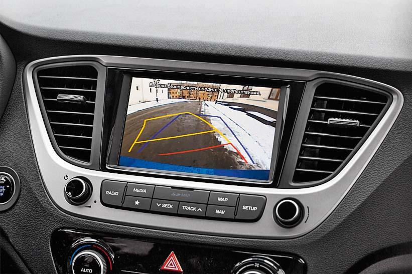 Топливный бак наконец-то увеличен на 7 литров, до 50 л, об этом настойчиво просили владельцы. А бачок омывателя вместит содержимое стандартной канистры синей жидкости – 4,6 л. Можно заказать обогрев переднего стекла и форсунок омывателя, установить датчик давления в шинах, светодиодные ходовые огни и фонари. В топовой версии у Solaris мультимедийная система с 7-дюймовым тачскрином, навигацией и телематическими сервисами TomTom. Настоящий эксклюзив: такой «головы», с интерфейсами Apple CarPlay и Android Auto нет ни у «Креты», ни у «Элантры». На экран системы выводится картинка с камер заднего вида, которая прежде транслировалась на салонное зеркало.