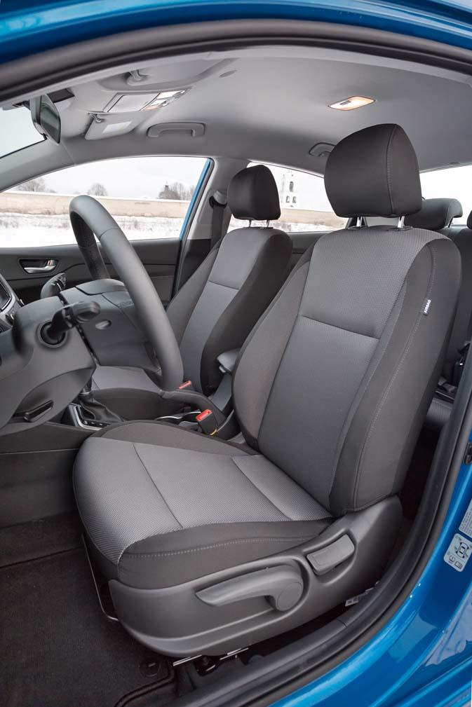 «Солярис» подрос в ширину и длину на 30 мм (соответственно до 1700 и 4405 мм), неизменными остались клиренс (160 мм) и высота автомобиля (1470 мм). На кузове никаких стреловидных выштамповок и резких граней. Новая решетка, забегающие на крышку багажника фонари и более пропорциональный и сбалансированный силуэт заставляют вспомнить о старшем родственнике, седане Elantra. Их родство внешностью не ограничивается, но об этом чуть позже. Трехсантиметровый прирост внешних габаритов, как, впрочем, и аналогичное увеличение колесной базы (до 2600 мм), несильно отразились на салоне. На задних рядах все так же для ног вполне достаточно места, но его чуть не хватает по высоте, и прибавка в 3 мм между подушкой дивана и потолком ничего не меняет – особо долговязые граждане помнут прическу об обивку потолка. Зато холодно не будет – Solaris впервые предлагает двухступенчатый подогрев заднего ряда (опция).