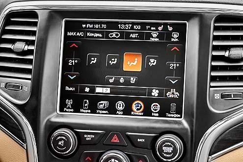 Электрорегулировки сидений и руля для Ford Explorer в богатой комплектации Limited Plus и Jeep Grand Cherokee в топовом на данный момент для машин с V6 исполнении Overland – дело само собой разумеющееся. Но посадка за рулем различается: в Jeep, по традиции, рулевое колесо стоит почти вертикально, у Ford – более отлого. Диапазоны перемещения кресел велики в обоих автомобилях, но у Ford вдобавок можно изменить положение педального узла, что полезно для водителей небольшого роста. Jeep такой возможностью не располагает. На кожу в отделке не поскупились: ею обтянуты не только кресла, но и передняя панель целиком. Найти общий язык с медиасистемой достаточно легко, экран радует точностью отклика. Важные функции продублированы крупными кнопками и рукоятками – удобно пользоваться на ходу, не отвлекаясь от дороги Еще одна милая «фишка» Ford – омыватели, встроенные в переднюю и заднюю видеокамеры. Площадка для отдыха левой ноги значительно удобнее в Grand Cherokee – чтобы пристроить на нее ступню в Explorer, ногу приходится поджимать и сгибать.