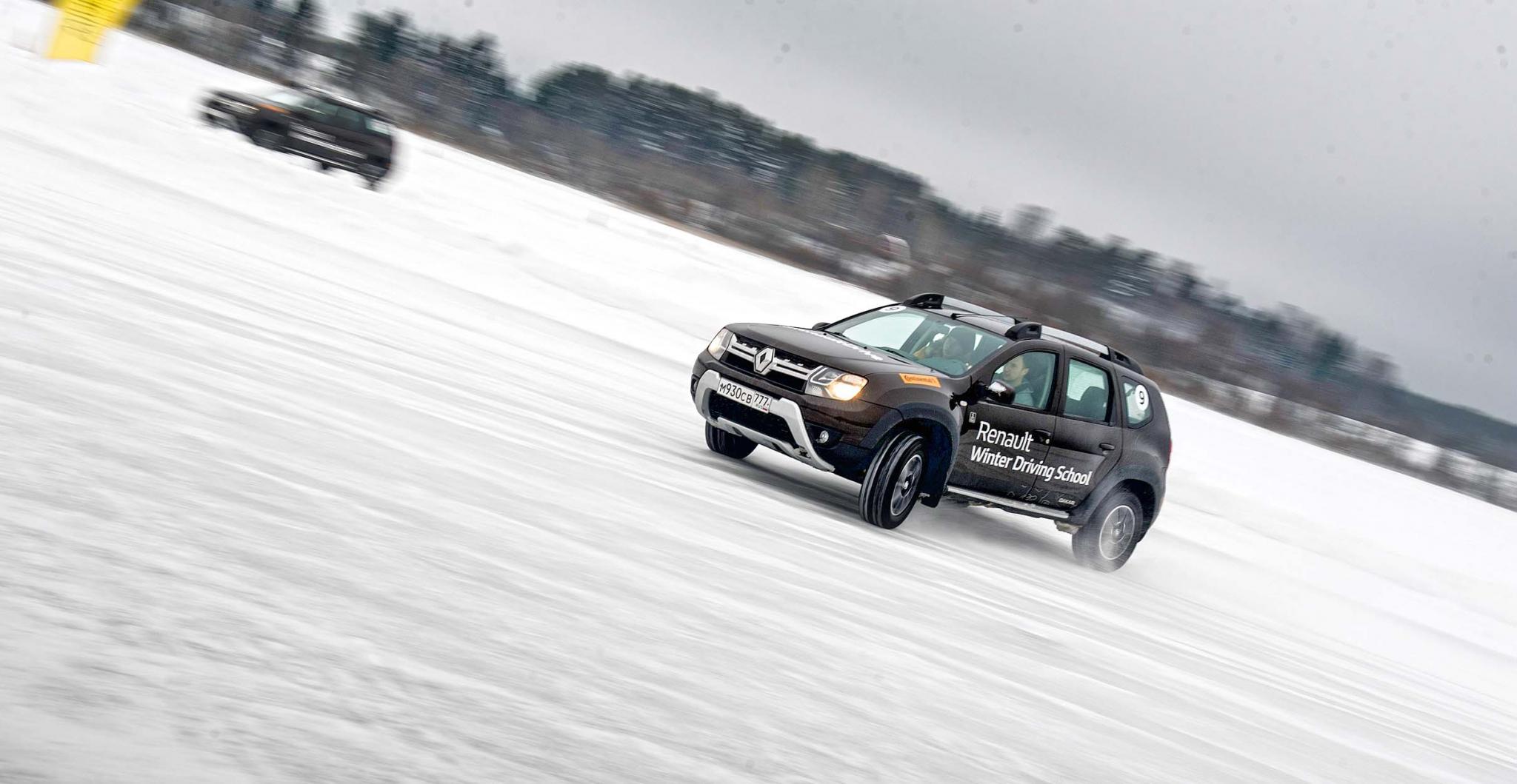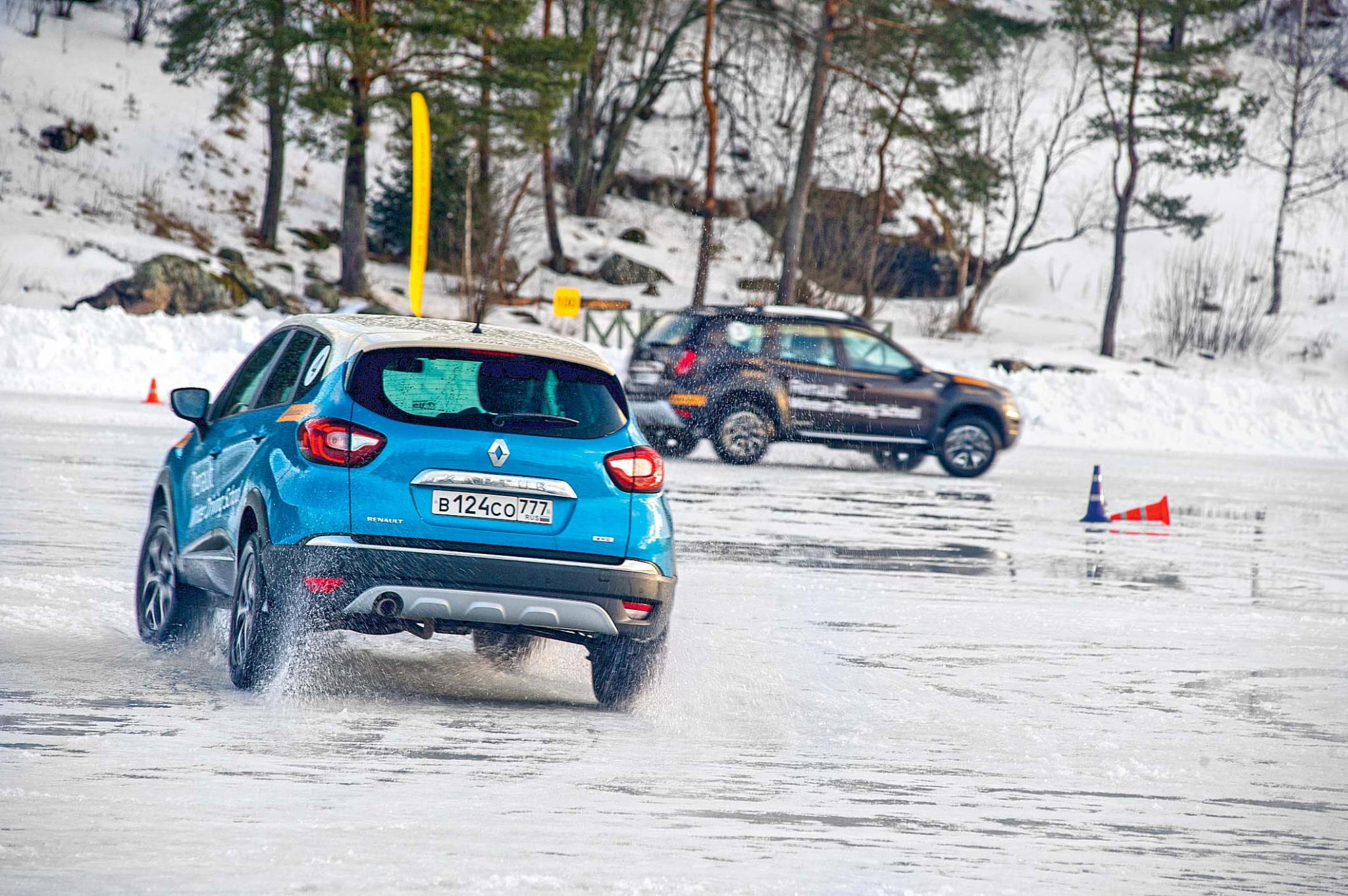После этого представить Duster чисто выписывающим восьмерки на льду было ну очень сложно. И вот – Карелия, хорошенько промерзшее Ладожское озеро в районе Сортавалы, «Зимняя школа вождения Renault». Ученики делят между собой несколько автомобилей Duster и Kaptur и выезжают на лед, где их ждут совершенно стандартные для подобных мероприятий упражнения. Разные скоростные змейки, особенно веселые при прохождении в управляемом ритмическом заносе, езда по извилистой ледяной трассе на время, «облизывание» конусов с разными техниками и разными смыслами, гонки на овале-«ипподроме» и под конец – полицейский разворот. Это все хорошо знакомо участникам зимних программ Audi, Porsche и BMW, но тут-то учат экстремальным маневрам не на спорткарах!
