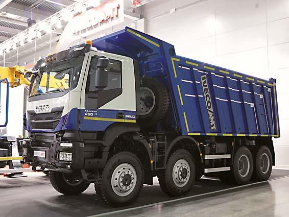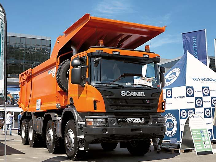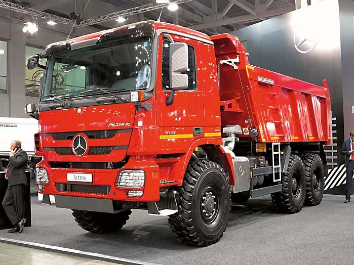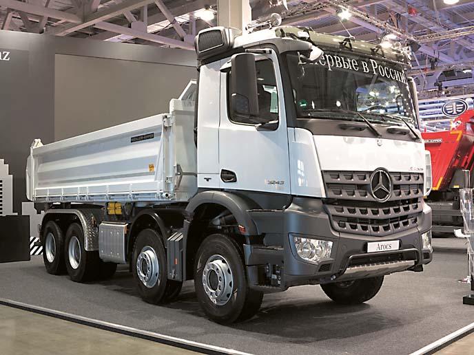 Главной премьерой на стенде Mercedes-Benz стал самосвал нового поколения полной массой 32 т – Arocs 3243K (8х4). Кузов объемом 14 м3 с трехсторонней разгрузкой. Двигатель мощностью 428 л.с. развивает 2100 Нм крутящего момента и соответствует экологическому стандарту Евро-6. С ним агрегатирована КП третьего поколения с автоматическим переключением передач и режимом Off road. Еще одной новинкой был самосвал для работы в условиях Крайнего Севера – Actros 3341 в односкатном исполнении (6х6). Грузоподъемность 19 т, двигатель развивает 408 л.с. и 2000 Нм крутящего момента. На эти новые самосвалы установлена гарантия три года либо 250 тыс. км пробега.