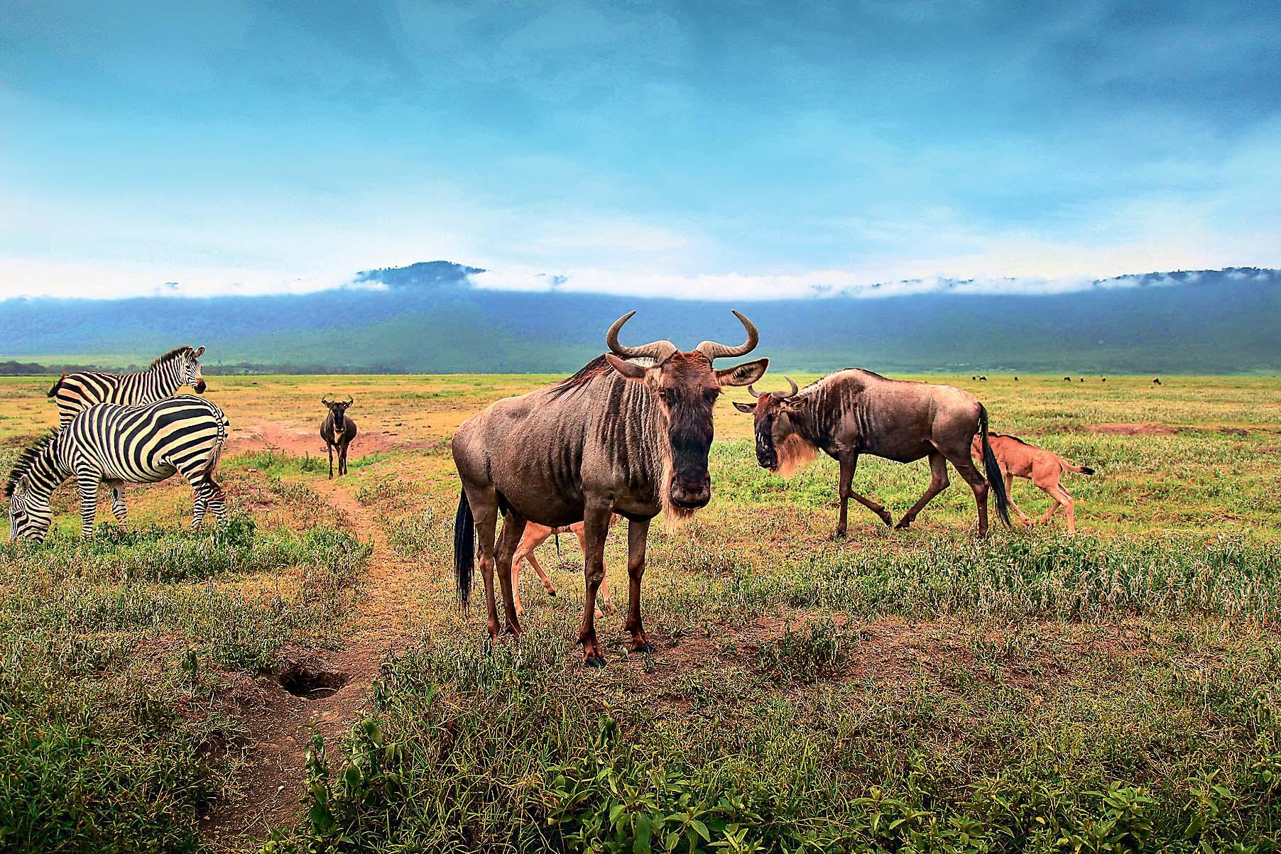 По небольшому серпантину Land Cruiser спустил нас на самое дно кратера, и мы снова оказались в совершенно инопланетном мире. Водитель периодически останавливал машину и глушил двигатель, чтобы мы вдоволь могли насладиться звуками природы. Размеренные переклички гну, щебет птиц, шаги буйволов… А вот совершенно сюрреалистичная картина: вокруг ни души, только зеленая равнина и слон, одиноко идущий к водопою. Передать словами ощущения очень сложно, фотографии расскажут о них намного ярче. Скажу главное: программа-максимум была выполнена, ведь кроме упомянутых животных мы встретили страусов, гиен, черных носорогов, крокодилов, африканских бородавочников, газелей Томпсона, леопардов, множество фламинго и других птиц и даже целый прайд львов. Мир вокруг нас уникален и удивителен. Танзания – одна из тех стран на планете, где вы получите не просто потрясающие, а бесценные впечатления.