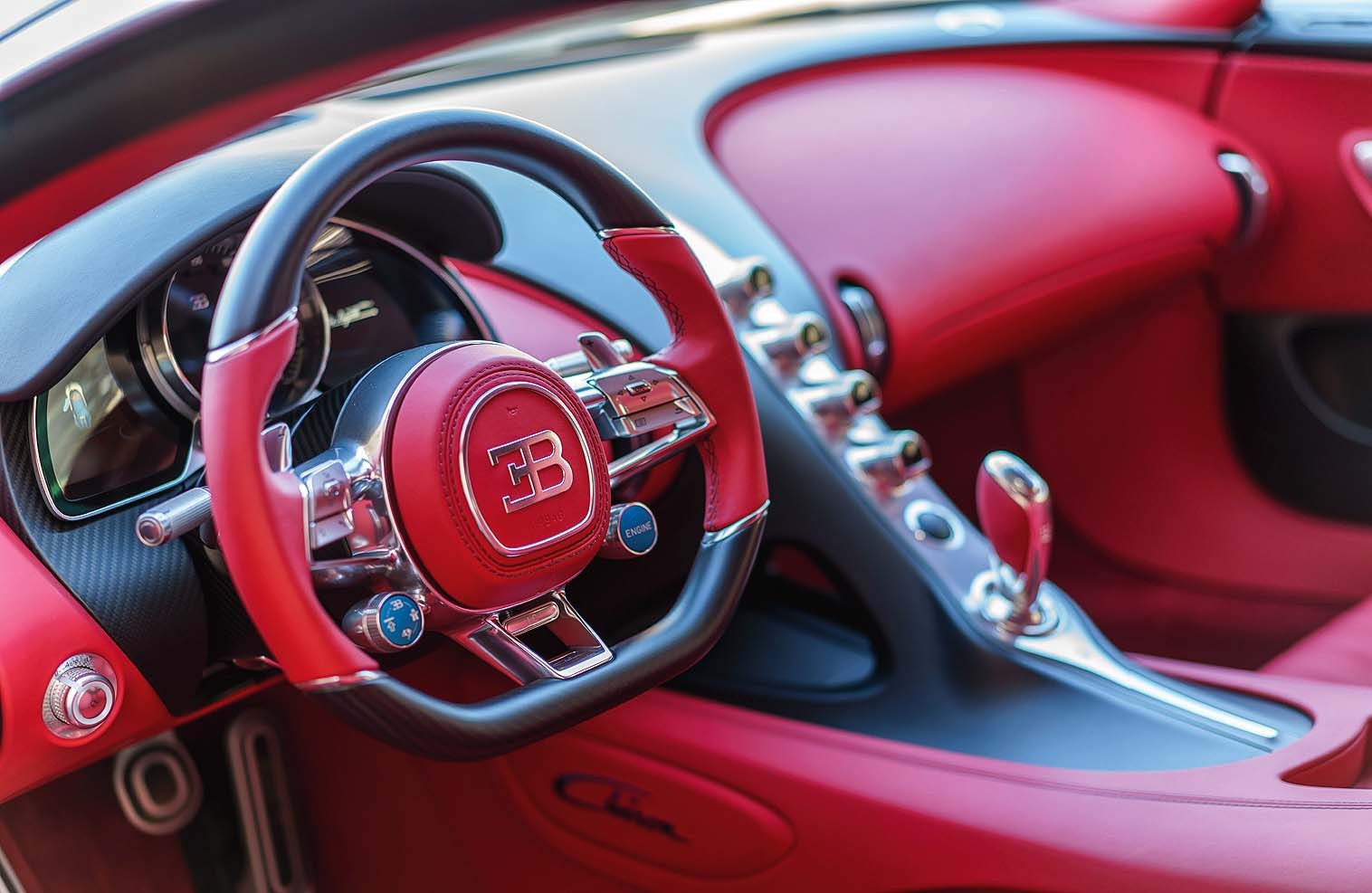 Водитель удобно сидит в интегрированном в шасси кресле, перед ним три основных прибора: по центру панели – аналоговый тахометр, чья заставка меняется в зависимости от выбранного режима. Стоит отметить, что с ростом скорости на экране отображается все меньше информации, что облегчает ее восприятие. На ступице руля две крупные синие клавиши: правая отвечает за пуск двигателя, а левая – за выбор режима движения и включение программы Lift, в которой подвеска приподнимает кузов (дорожный просвет 125 мм как спереди, так и сзади), чтобы легче преодолевать перепады асфальта. Режимов вождения четыре: EB (Ettore Bugatti), Autobahn, Handling и Top speed. В каждом меняется алгоритм действий систем стабилизации и контроля тяги, а также степень демпфирования амортизаторов, настройки коробки передач, рулевого управления, полного привода и элементов активной аэродинамики.