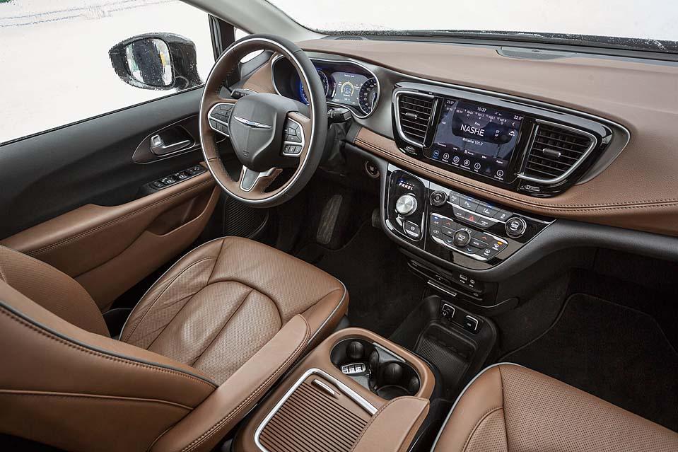 Чувствуется, что машину создавали заботливые женские руки. Находиться в салоне «Пацифики» приятно, интерьер стильный, с нотками премиальности, но при этом очень уютный. Посадка за рулем поистине американская – управлять машиной можно полулежа на мягком кожаном кресле, благо диапазон регулировок позволяет. Безоговорочная победа дизайнеров – шайба селектора АКП, она здесь очень к месту, удобна в использовании и экономит пространство за счет отказа от громоздкого рычага коробки под передней панелью или традиционной для заокеанских вэнов «кочерги» под рулем. Единственное неудобство – слишком низко расположенные розетки для зарядки гаджетов и некоторые огрехи эргономики: подогрев сидений, например, можно включить только через интерфейс мультимедийной системы. Последняя, к слову, достаточно удобна, проста в освоении и выдает отменный звук через 20 динамиков (опция за 150 000 рублей).