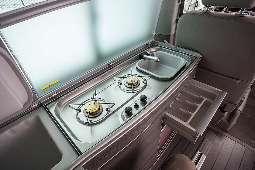 У California возможности для трансформации не такие впечатляющие, но подкупает немецкий минивэн другим. Если Pacifica это небольшая квартира, то Volkswagen – настоящий дом на колесах со всеми необходимыми удобствами, в числе которых наличие газовой плиты, раковины и душа. В этой полноприводной гостинице действительно можно жить. Кухня хоть и небольшая, но полноценная, со множеством полочек и отделений. Для размещения кухонной утвари и другого скарба это очень удобно, но есть и минус – всю поклажу нужно тщательно закрепить, иначе во время движения она будет постоянно напоминать о своем присутствии дребезжанием и звоном.