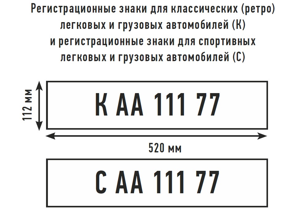 Владельцы ретроавтомобилей и спорткаров получат на номерные знаки дополнительные символы – буквы «К» и «С» соответственно. В ближайшем будущем это ни на что не повлияет, однако позже для автомобилей таких типов могут появиться дополнительные ограничения в ПДД. Размер номерных табличек останется стандартным – 112х520 мм, так что компоновка символов на таких знаках будет чуть более плотной.