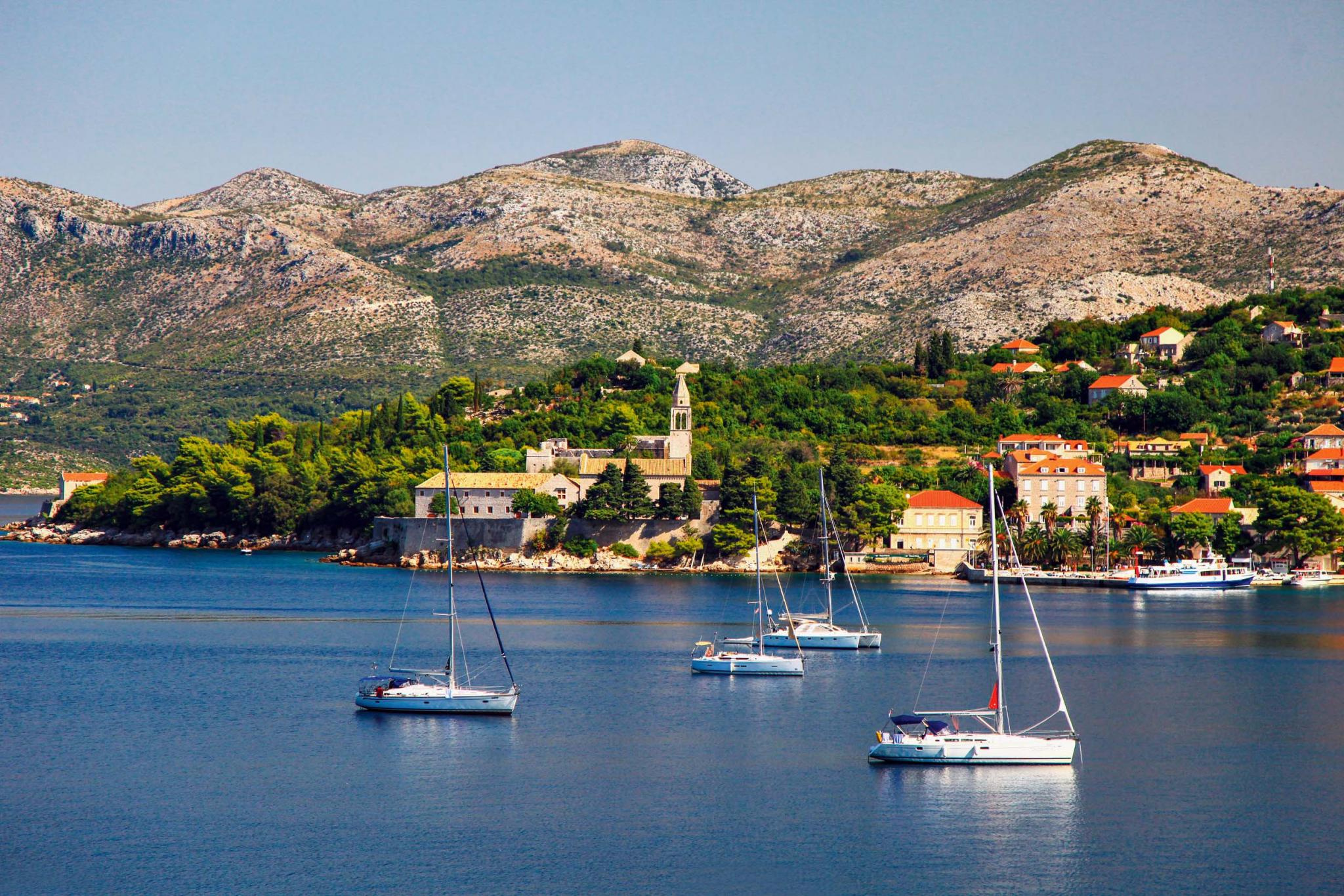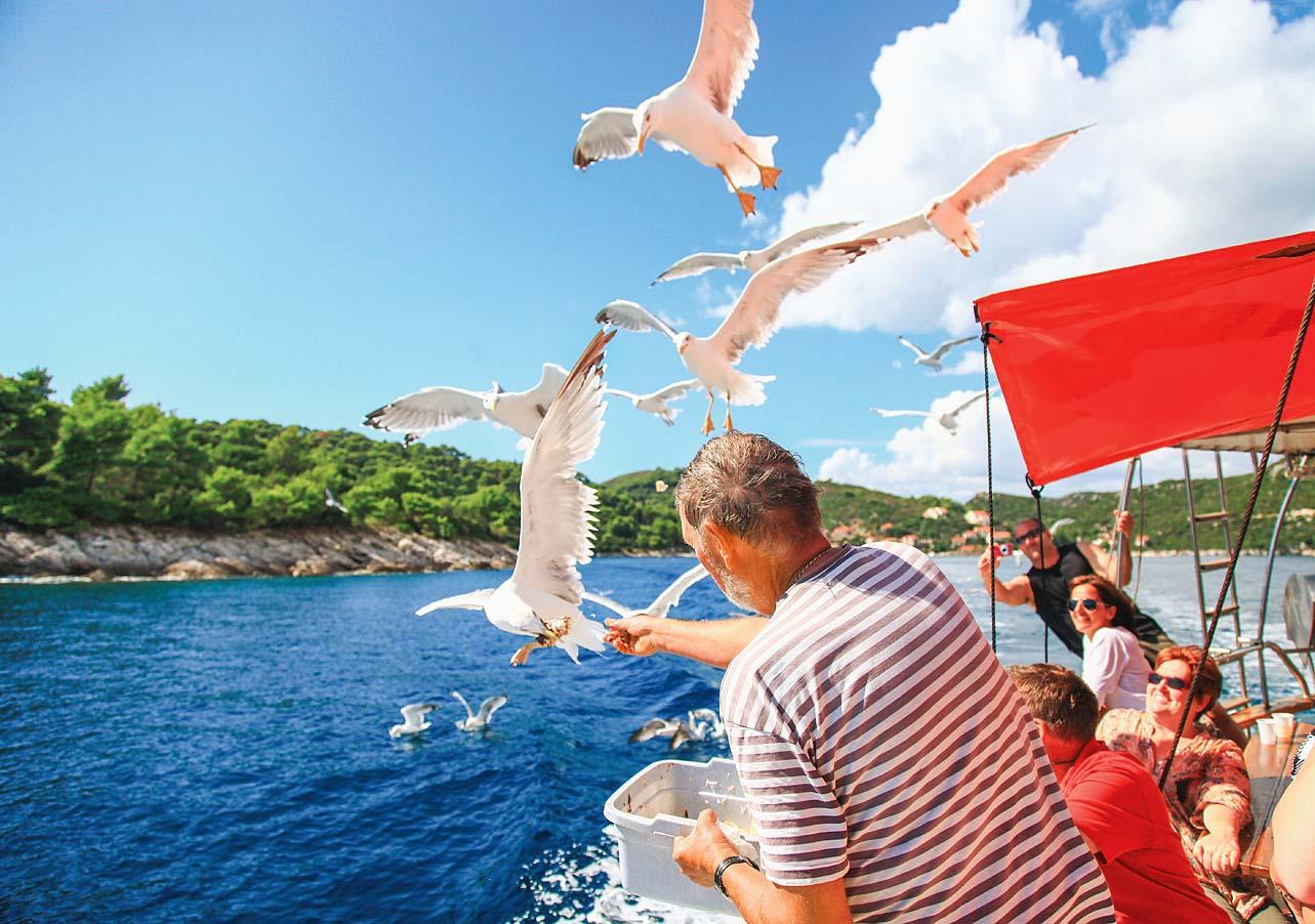 На причале приглашают на многочисленные морские экскурсии. «It’s now or never! (Сейчас или никогда!)» – зазывалы напевают Элвиса Пресли, разве можно устоять?! Так мы оказались на скоростном катере, мчащем на ближайшие острова Колочеп и Лопуд (в пяти километрах от Дубровника). Несколько остановок для купания и отдыха на берегу, ланч, пересадка и прогулка на паруснике – программа выдалась очень насыщенной.
