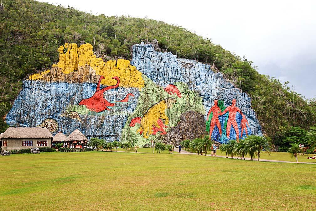 Из Гаваны стоит съездить еще в несколько интересных мест, например в долину Виньялес. Около 180 километров пути – и мы очутились в Пинар-Дель-Рио, столице провинции с одноименным названием, где посетили завод рома и фабрику сигар. Фотографировать на фабрике оказалось запрещено, но не из-за секретов производства сигар (кстати, большинство из них в стране поддельные и изготавливаются кустарно, а потом всеми возможными способами «впариваются» туристам под видом фирменных, так что будьте бдительны), а из-за довольно суровых условий работы ее сотрудников. Еще километров 30 – и мы попадаем в долину, занесенную в список Всемирного наследия ЮНЕСКО – Виньялес, известную своими отвесными холмами высотой до 400 метров и возрастом, по некоторым данным, в 160 миллионов лет. Здесь же, на откосе одной из скал, художником Леовихильдо Гонсалесом нарисована огромная фреска «Mural de la Prehistoria», которая по его замыслу олицетворяет сотворение мира.