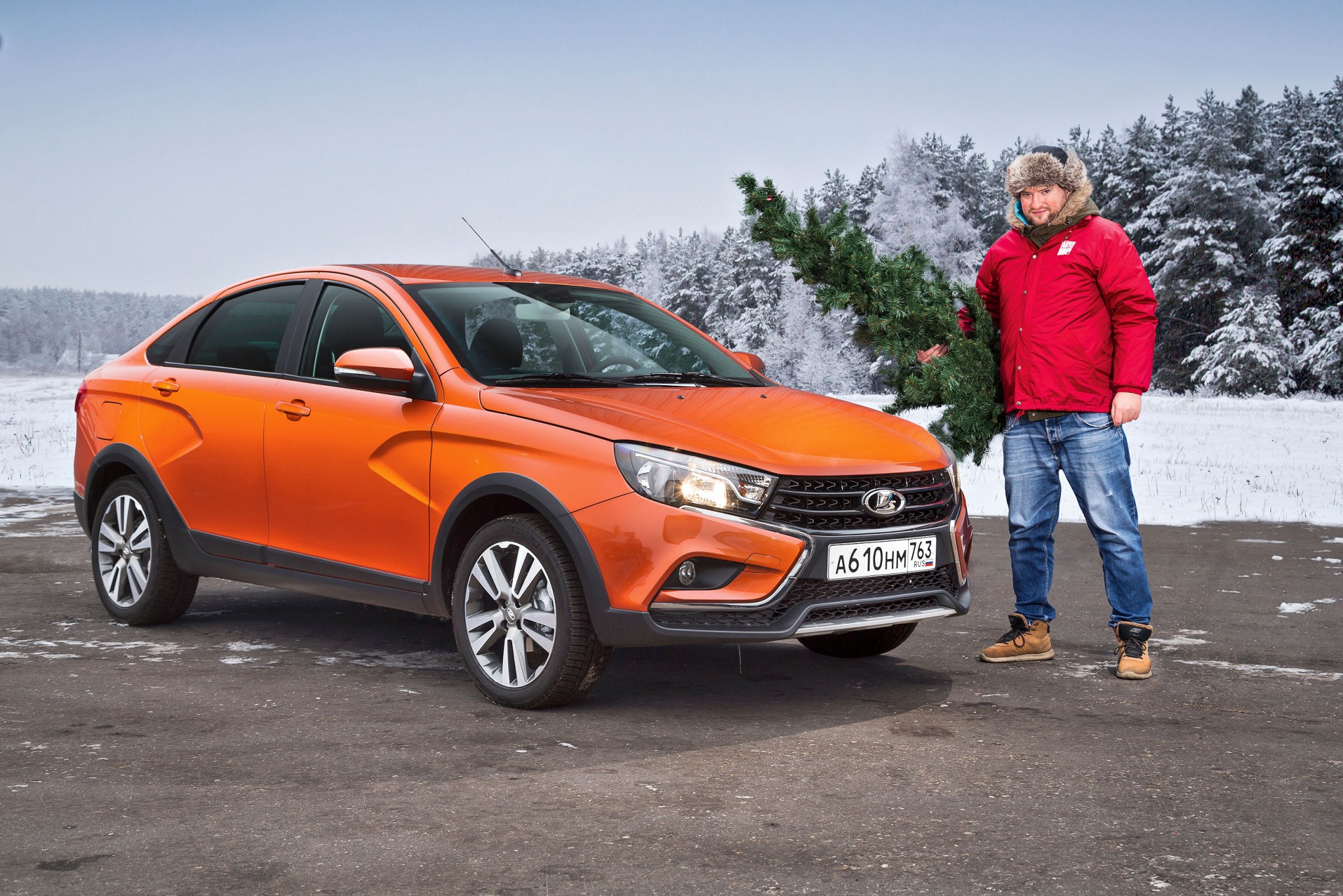 Оранжевый седан Lada Vesta Cross сочетается с зимними российскими дорогами так же хорошо, как сочетаются мандарины с празднованием нового года