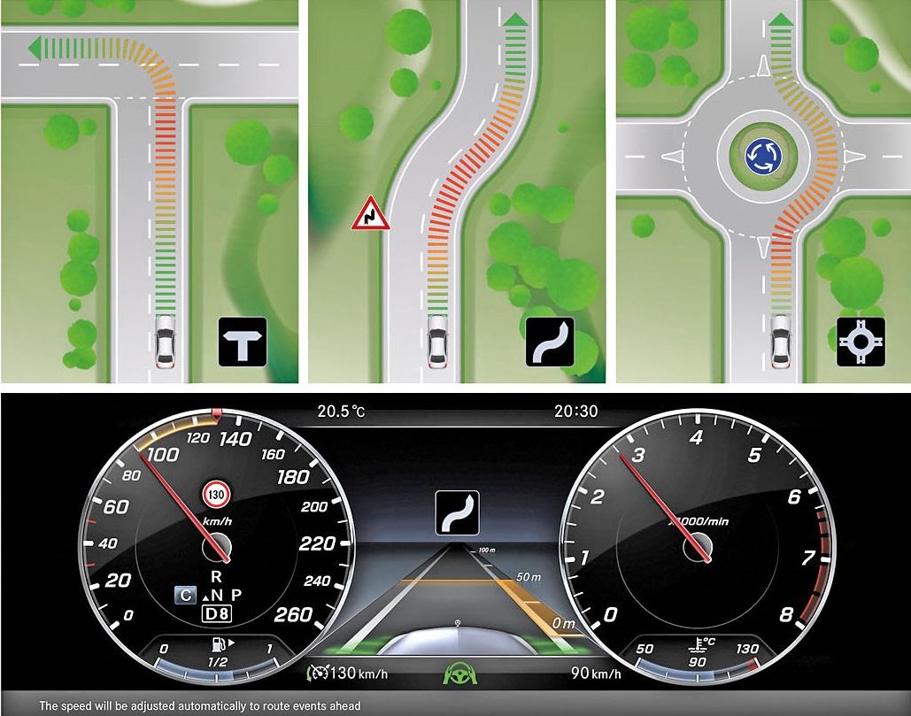 Он полностью контролирует скорость и выдерживает безопасную дистанцию, руководствуясь не только заданными вами лимитами, но также предписаниями дорожных знаков и навигационными картами. То есть, при установленной водителем планке в 100 км/ч, на въезде в населенный пункт Mercedes притормозит до легальных 60 км/ч, а зная, что впереди по маршруту будет медленный поворот, автомобиль заранее сбросит скорость до оптимально безопасной. До рестайлинга такой прозорливости у немецкого седана не наблюдалось.