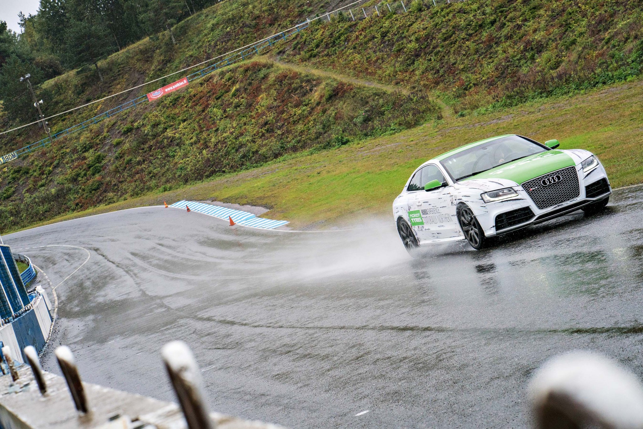 На шоссе я действительно не заметил какого-либо дискомфорта. Ход мягкий, почти бесшумный. Реакции автомобиля на поворот руля четкие и ясные. А как же хваленая «водостойкость»? Скажу честно, так быстро я еще по мокрому треку не ездил. Разумеется, сидящий рядом инструктор добавляет уверенности и в какой-то мере страхует от ошибок. Автомобиль, несмотря на ливень, уверенно разгонялся, надежно тормозил и, если и начинал скользить, то делал это мягко и интеллигентно. Не спорю, у Audi RS5 прекрасное шасси, но без помощи Hakka Black 2 вряд ли купе держалось бы на залитой водой трассе столь цепко и надежно.