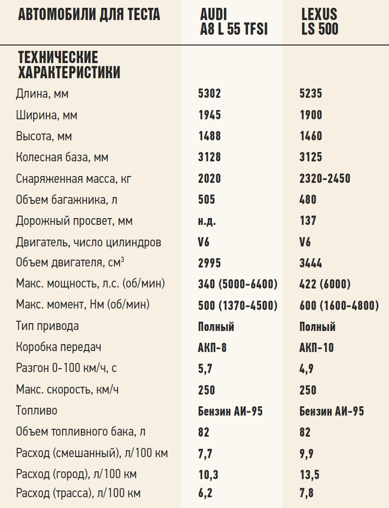 По пространству в заднем ряду Audi выигрывает – А8 просторнее, чем Lexus LS. Но не будем забывать, что у нас на тесте не стандартная, а удлиненная версия немецкого седана, с увеличенной на 130 мм колесной базой. Lexus же существует только в одном размере – и, несмотря на то, что габаритная длина его меньше на 67 мм, он лишь на 3 мм уступает в величине базы удлиненному Audi.