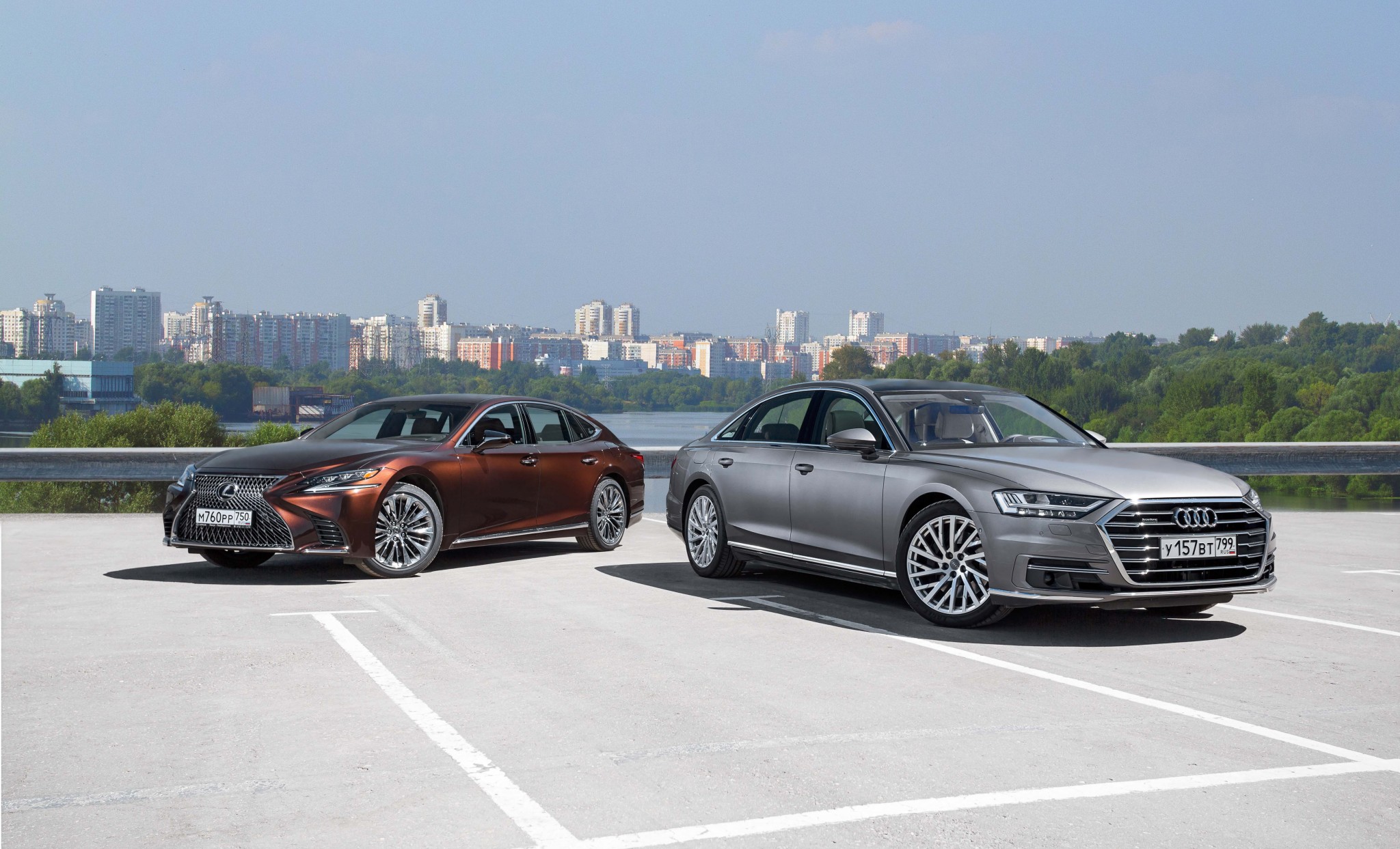 Наряду с преимуществом в мощности Lexus и весит побольше, и на ходу это ощущается – удлиненная Audi воспринимается менее тяжеловесной, хотя в спокойном режиме передвижения коробка A8 меняет передачи чуть более заметно. Все же 10-скоростная АКП в Lexus ведет себя почти как вариатор. Управляемость надежна у обеих машин, но все же отклик Audi на действия стоит признать более чистым.