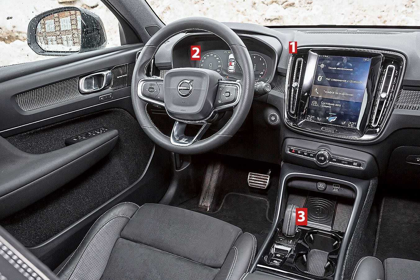 Снаружи Volvo выглядит лаконично и красен, разве что, углами. Все самое интересное обнаруживается в салоне, где большие графические дисплеи приборной панели и мультимедийной системы по творческому дизайнерскому велению соседствуют с войлочными вставками на обивке дверей. Не особо тривиально, мягко говоря. И не скажу, что весь этот авангард мне безусловно нравится. К выполненным на манер офисных креслам претензий нет. Скроены они ладно и максимально удобны.