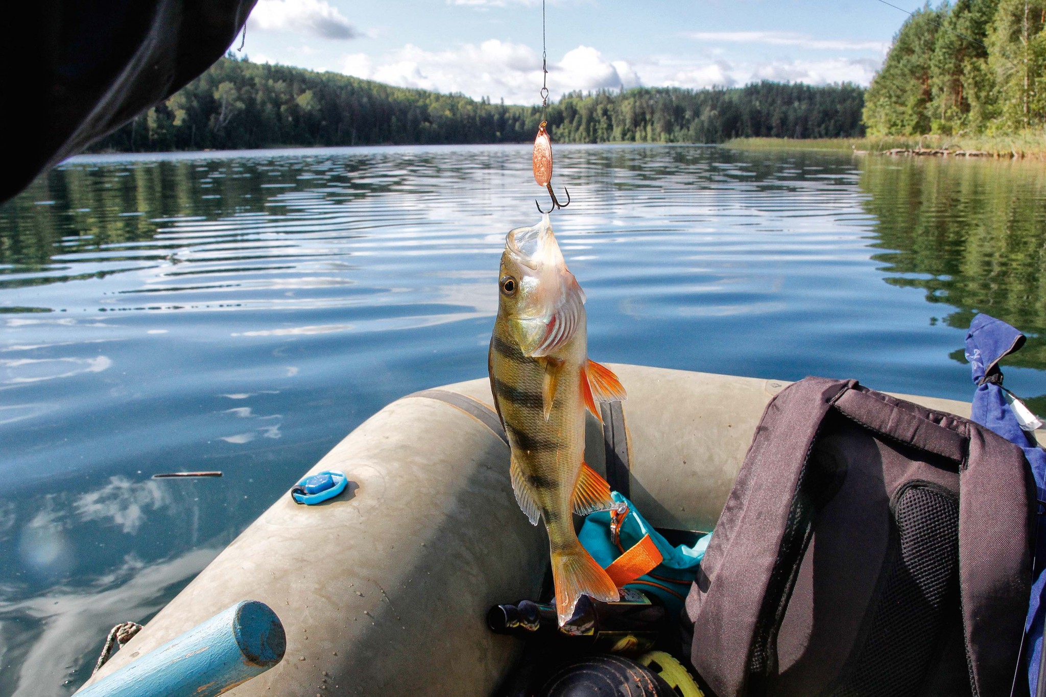 Мелочовка клюет бойко даже в жару. Любопытно, на удочку (когда-то на поплавочку попадалась и запрещенная ряпушка) ловить менее интересно. А когда бросаешь при помощи спиннинга с тестом до пяти граммов маленькую блесенку или двух-трехграммовый воблерок к берегу, с глубины, поклевки следуют одна за другой, пока не перетягаешь всю бестолковую стайку. Однако такой улов следует отпускать восвояси.Подлещик и карась в озере никогда не водились. Традиционная прикормка может сутками лежать у берега на метровой глубине. Рыба не подходит. Ну а что происходит в 30-метровых ямах, только речному дьяволу известно.