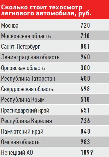 Максимальная стоимость техосмотра в России определяется законодательно, но для каждого субъекта федерации отдельно. Разброс цен по стране – более чем в два раза. Мы приводим примеры цен на техосмотр легковых автомобилей в некоторых регионах России. Полные данные о стоимости ТО в том или ином субъекте федерации и для разных категорий транспорта можно найти на официальном сайте Российского союза автостраховщиков.