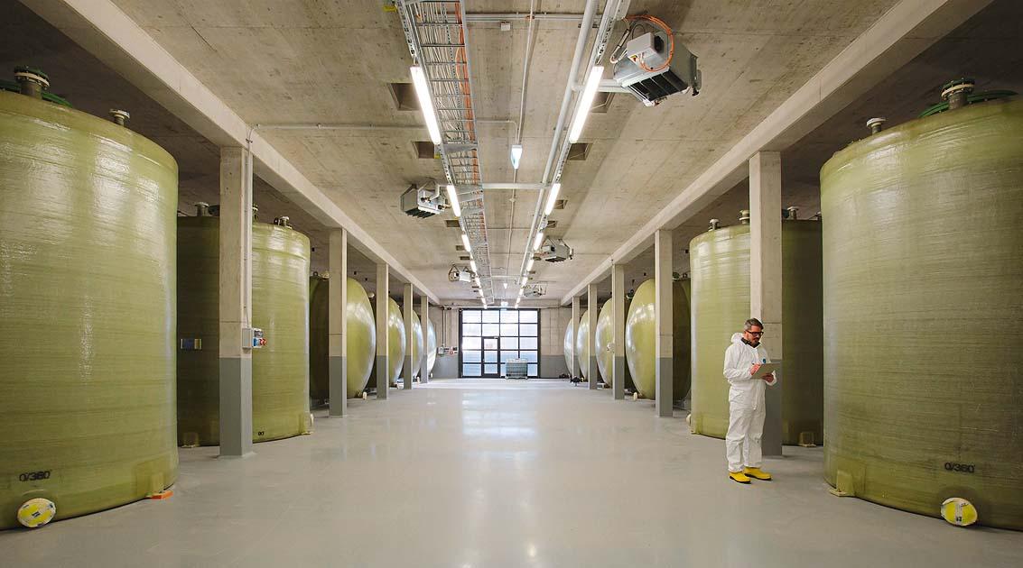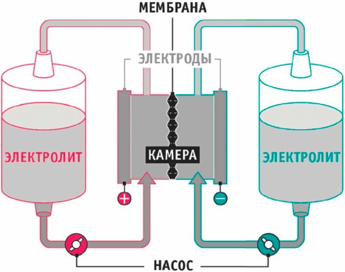Проточные батареи уже используется в промышленности в качестве энергетических буферов. В ядре проточной батареи находится мембрана, с каждой стороны которой размещены растворы электролита. Ионный обмен между ними и приводит к выработке электроэнергии. Процесс можно обратить вспять, то есть при подаче напряжения на электроды ионы начнут двигаться в обратном направлении через мембрану, а электролит станет заряжаться. Принципиально электрохимический процесс обычного аккумулятора очень похож. Но проточные батареи интересны тем, что электроды и мембрана не «реагируют» на электролит. Емкость батареи зависит не от компонентов аккумулятора, а исключительно от пополнения электролита, который находится во внешних резервуарах. Это могут быть контейнеры размером даже с целое здание.