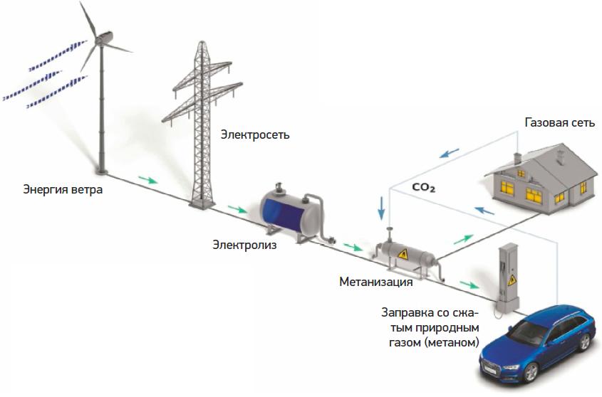 Audi g-tron используют обычные двигатели внутреннего сгорания, но они работают на природном газе – метане. То, что это в принципе возможно, не открытие: электрическая энергия сначала берется для процесса гидролиза, во время которого вода расщепляется на кислород и водород. Водород отделяется в специальный «танкер» автомобиля. Система Audi наглядно демонстрирует, что этот вид «электрогазификации» возможно применять в промышленных масштабах.