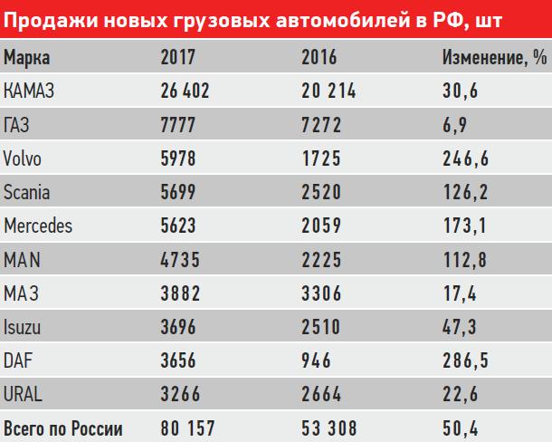 Аналитическое агентство «Автостат» опубликовало данные по продажам новых грузовиков и коммерческого транспорта в России. В обоих сегментах по итогам 2017 года – существенный рост. При этом увеличение спроса на грузовики у некоторых компаний выражается аж в трехзначных цифрах. Среди рекордсменов – Volvo, Scania и Mercedes-Benz. КамАЗ, на долю которого приходится треть нашего рынка новых грузовиков, показал рост на 30,6%.