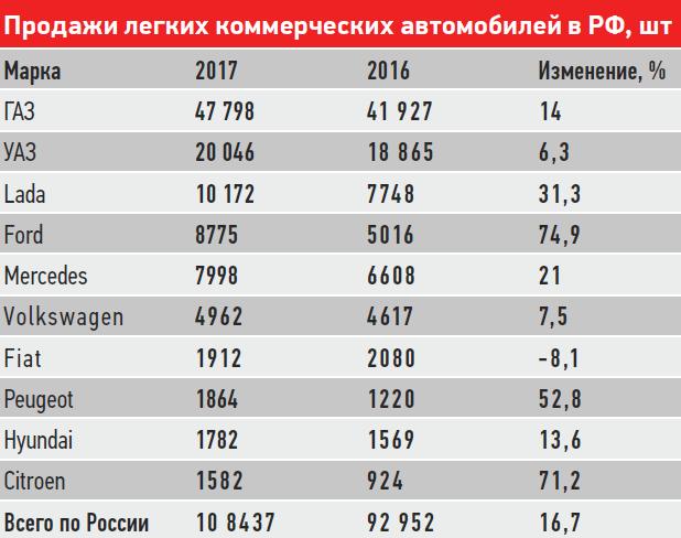 В сегменте грузовиков рост демонстрируют все бренды из топ-10. У легких коммерческих автомобилей, как сообщает «Автостат», все не настолько радужно. Средний результат – рост продаж в сегменте на 16,7% – получился во многом благодаря успеху лидера рынка, модели ГАЗель Next, спрос на которую вырос на 37,6%. При этом коммерческое подразделение Fiat закончило год с минусом, а УАЗ, Volkswagen и Hyundai, хоть и увеличили объем продаж своих LCV, но дотянуть до среднего по сегменту уровня роста не смогли. Впрочем, в 2017 году ситуация с коммерческими моделями может сильно измениться из-за появления новых сильных игроков – например, сменившего поколение Mercedes-Benz Sprinter, подробности о котором – на следующем развороте.