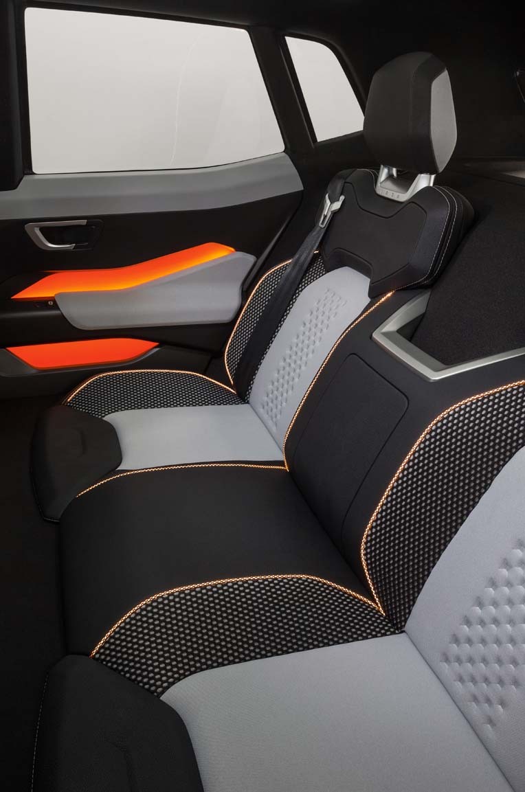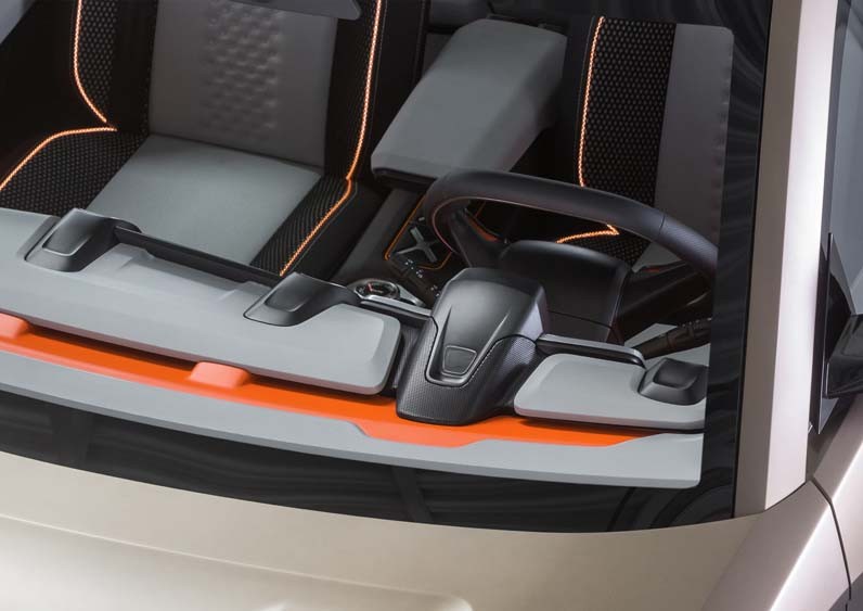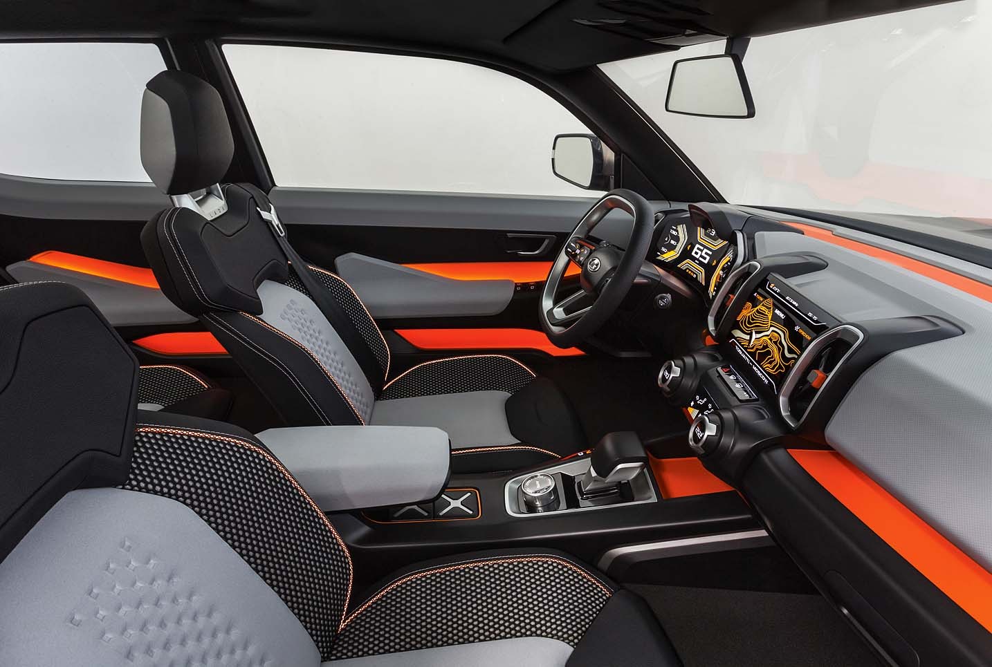Интерьер Lada 4x4 Vision не отстает от внешности. Его постарались сделать максимально ярким и фактурным. Фирменная икс-образная графика присутствует и на центральном тоннеле, и в вентиляционных дефлекторах, и в оформлении обшивки дверей. В тон оранжевым вставкам играет подсветка панели приборов и салона, которая имеет тот же оттенок. В обивке сидений сочетаются ткань с эффектом 3D, многослойный сетчатый текстиль и искусственная кожа. А справа, на противоположной стороне от топливного бака, расположена розетка на 220 вольт.