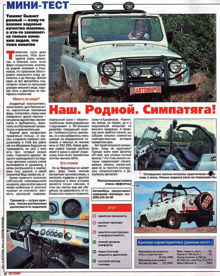 «Tюнингом, пусть даже внешним, УАЗа занимаются очень немногие, и большая часть таких фирм сосредоточена, конечно, на родине «козлика» в Ульяновске. Но стремление облагородить неказистого вояку докатилось и до Москвы. Взятый нами на тест автомобиль подготовлен только по программе внешнего вида, ходовая часть и двигатель не претерпели изменений».