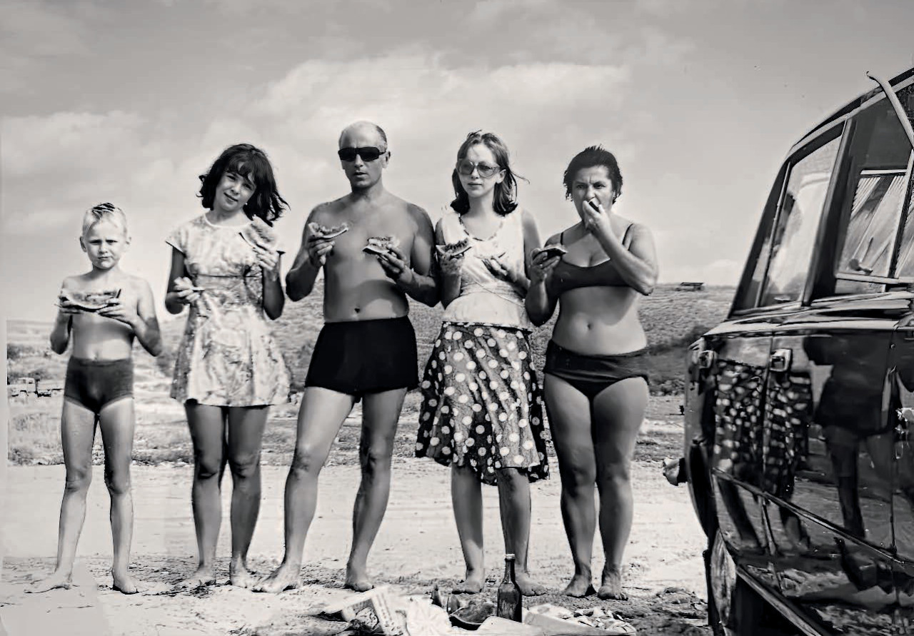 Однако на фотографии, как мы видим, обходятся без блюда, ножичков, тарелочек и вилок. Потому что не гости, а все свои. Смысл фото – как у современных карточек из отпуска. Конечно, не «сказочное Бали» и «апероль шприц» в одном кадре, но тоже неплохо. Например, недвусмысленно заявлено, что в семье имеется собственная легковая машина. Фотографию сложно датировать, текст на газете-скатерти нечитаем, но предположим, что дело происходит в начале 1980-х годов.
