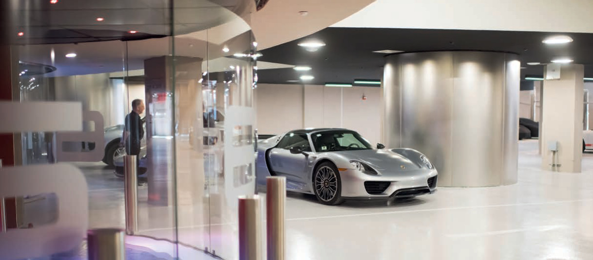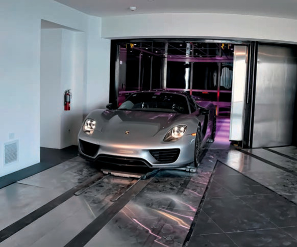 Porsche Design Tower стал, вероятно, первым из подобных проектов. Правда, надо оговориться, что знаменитый на весь мир автопроизводитель, а именно Porsche AG, прямого отношения к этому ЖК не имеет. Партнером девелоперских компаний Sieger Suarez Architects и Dezer Development выступила Porsche Design GmbH – компания, созданная Фердинандом Александром Порше в 1972 году и специализирующаяся на выпуске часов, солнцезащитных очков, кожгалантереи и прочих аксессуаров. Шестидесятиэтажный небоскреб в Майами начали строить в 2014-м. Башня высотой 196 метров на первой береговой линии Санни-Айлс-Бич выросла за три года. Площади жилых единиц варьируются от 400 до 1500 кв. м. Верхние этажи занимают два четырехэтажных пентхауса площадью по 2 тыс. кв. м. В каждом из них есть собственная «автомобильная галерея» на 11 парковочных мест. В остальных резиденциях – от двух до четырех парковочных мест, и расположены они так, что видны из жилого пространства. Стандартный «небесный гараж» на две машины занимает 48 кв. м. То есть на автомобиле можно подняться прямо в квартиру с помощью скоростного роботизированного лифта. Один из девизов проекта – «Автомобиль как произведение искусства». Поэтому машины как бы составляют важную часть интерьера, демонстрируясь как реликвия, за стеклом.